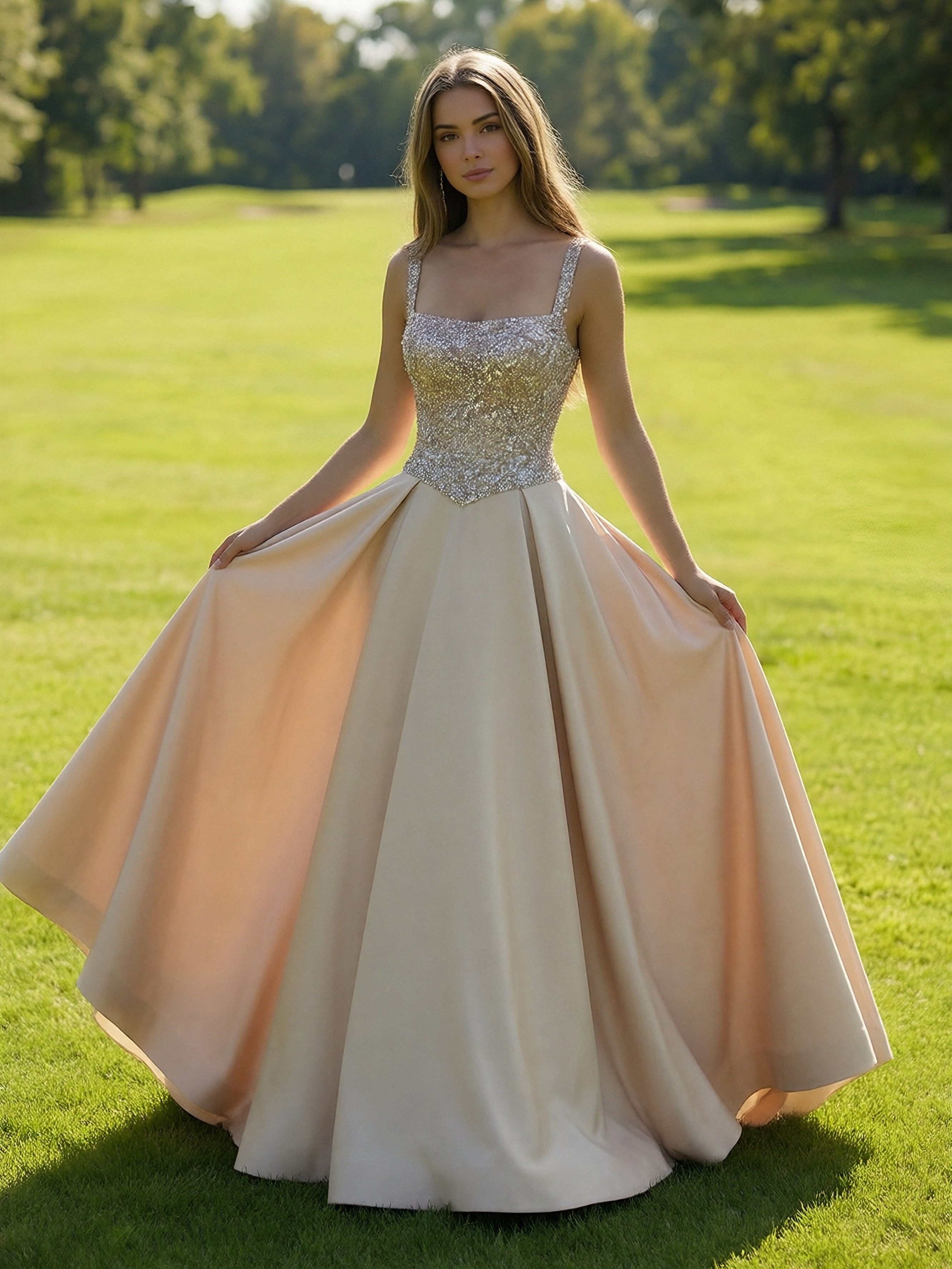 Satin Spaghetti Straps Long A Line Ball Gown with Sequin