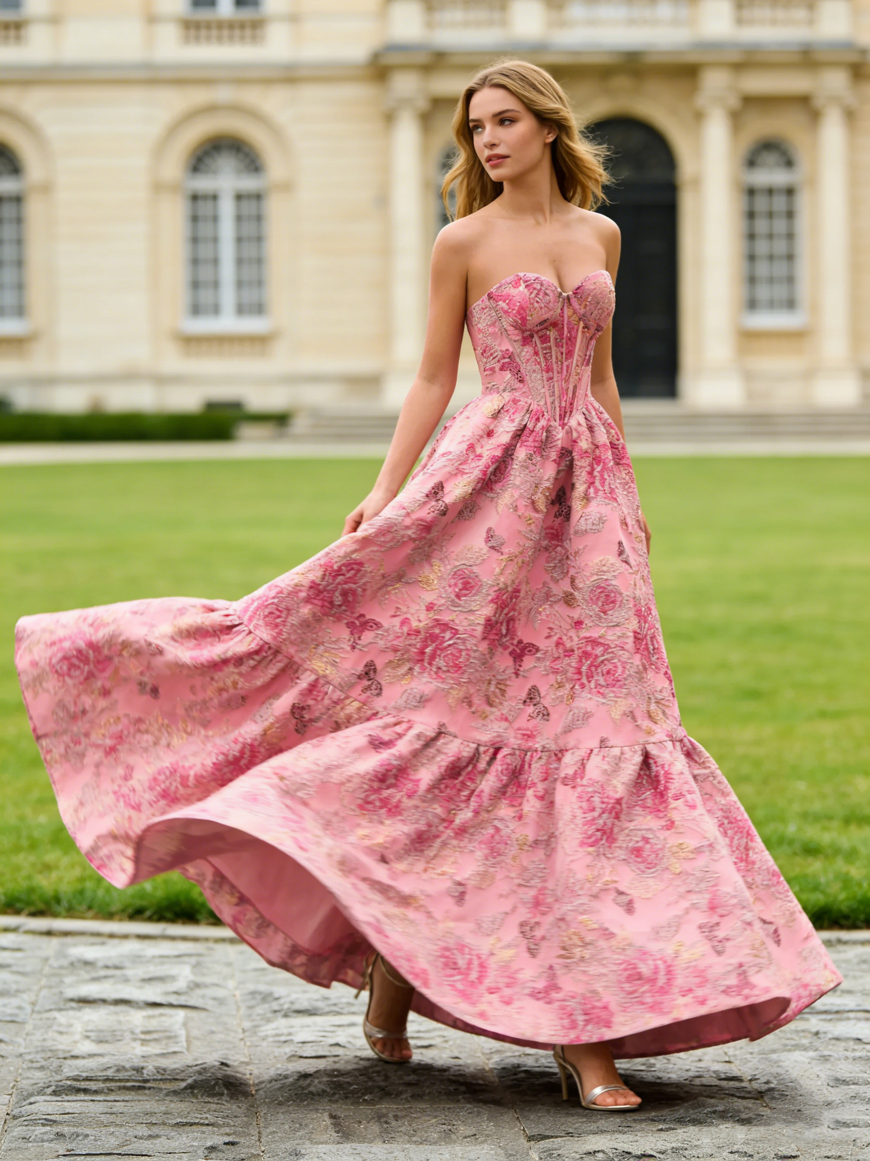 Floral V Neck Corset Gown Tiered Formal Dresses