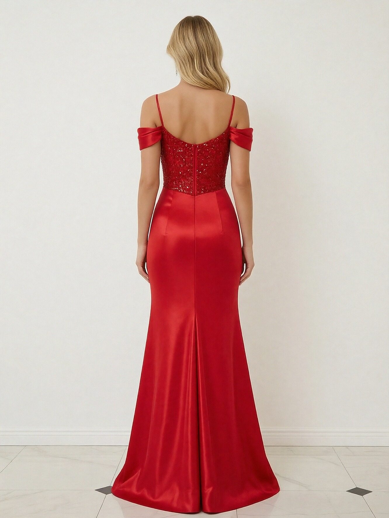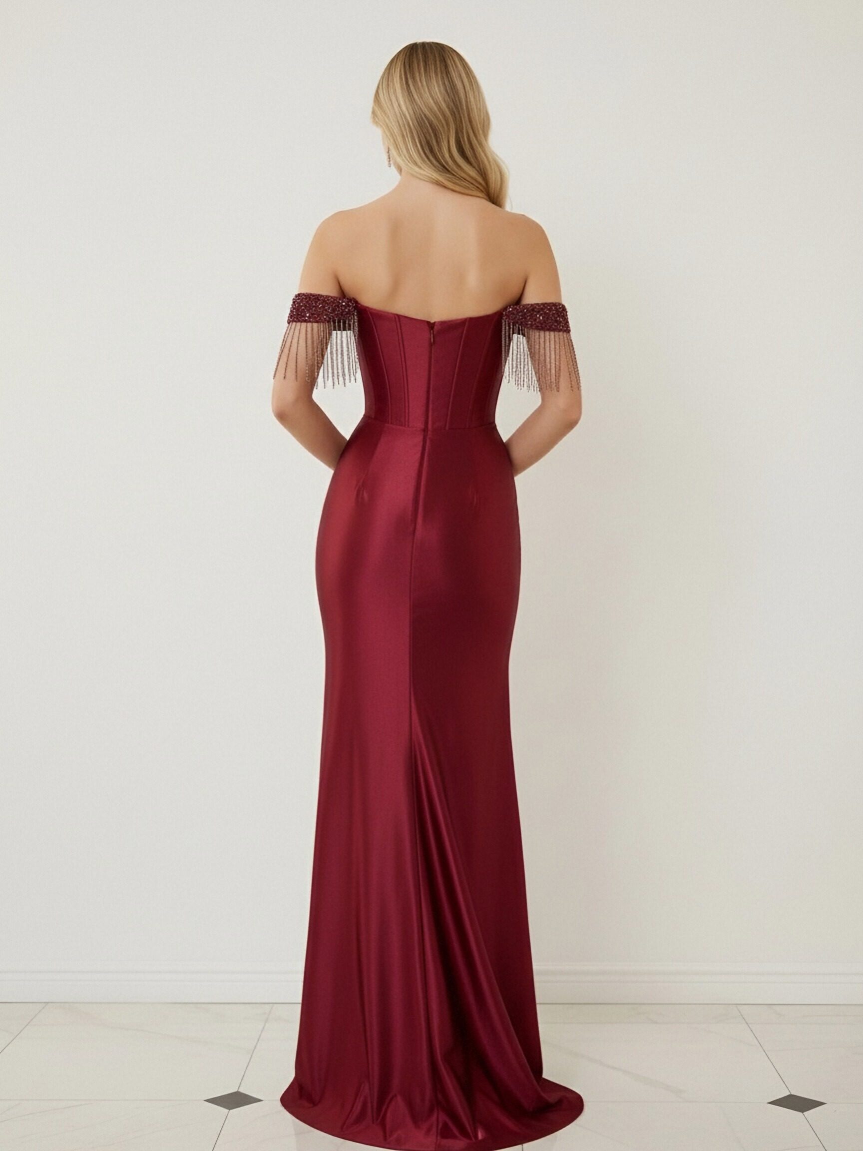 Satin Off Shoulder Mermaid Prom Dresses with Beads