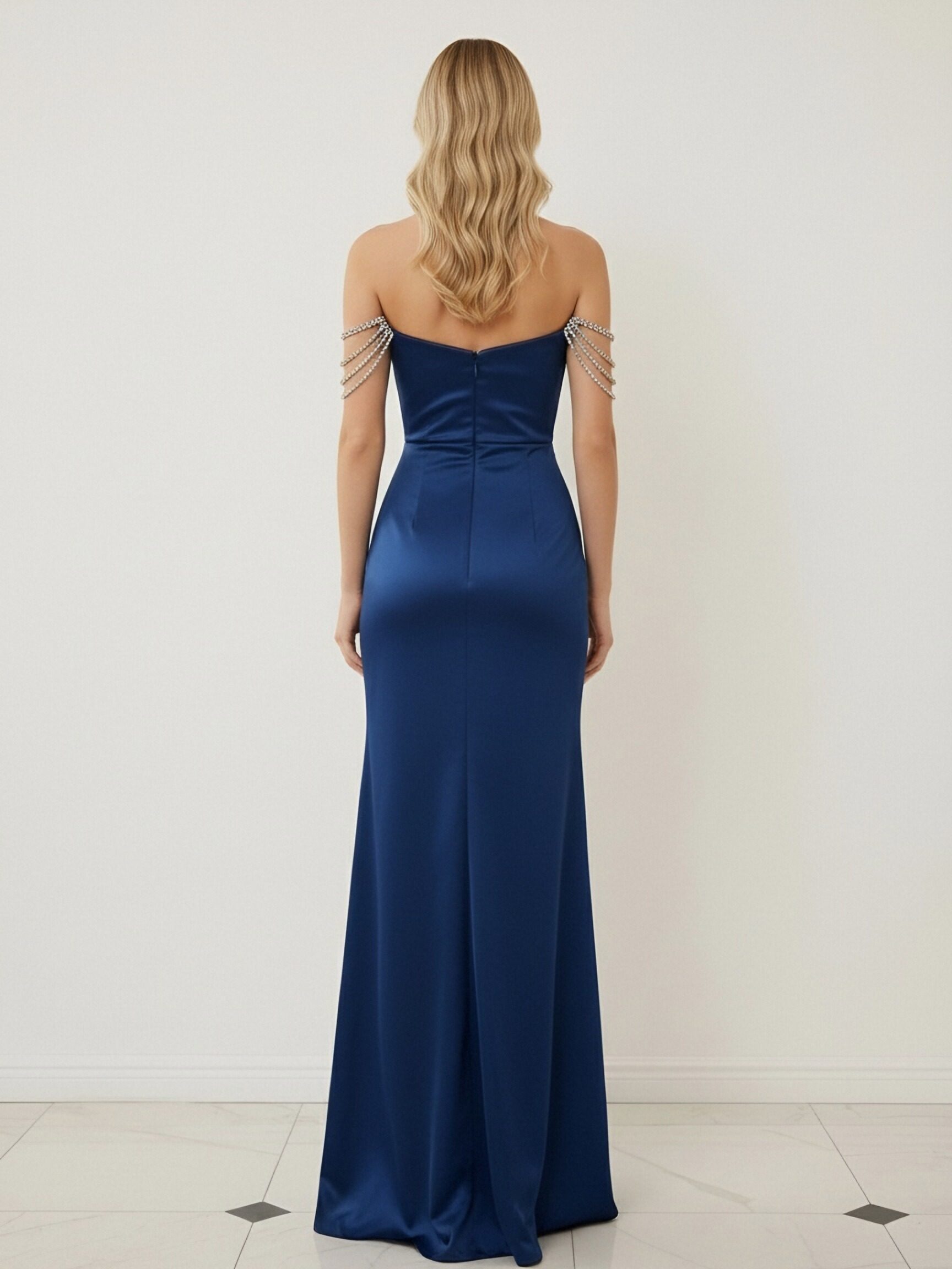 Satin Off Shoulder Mermaid Prom Dresses Rhinestone