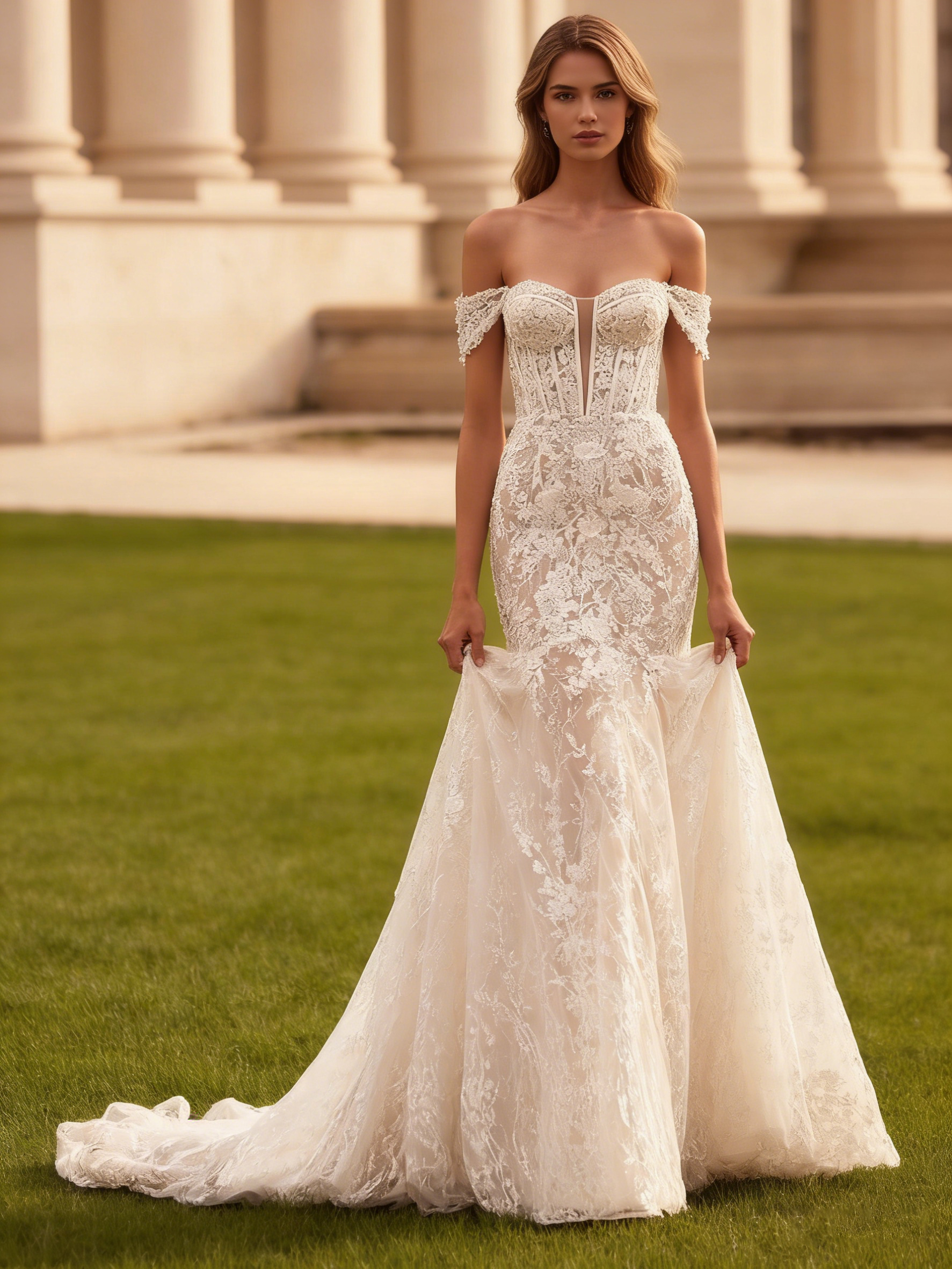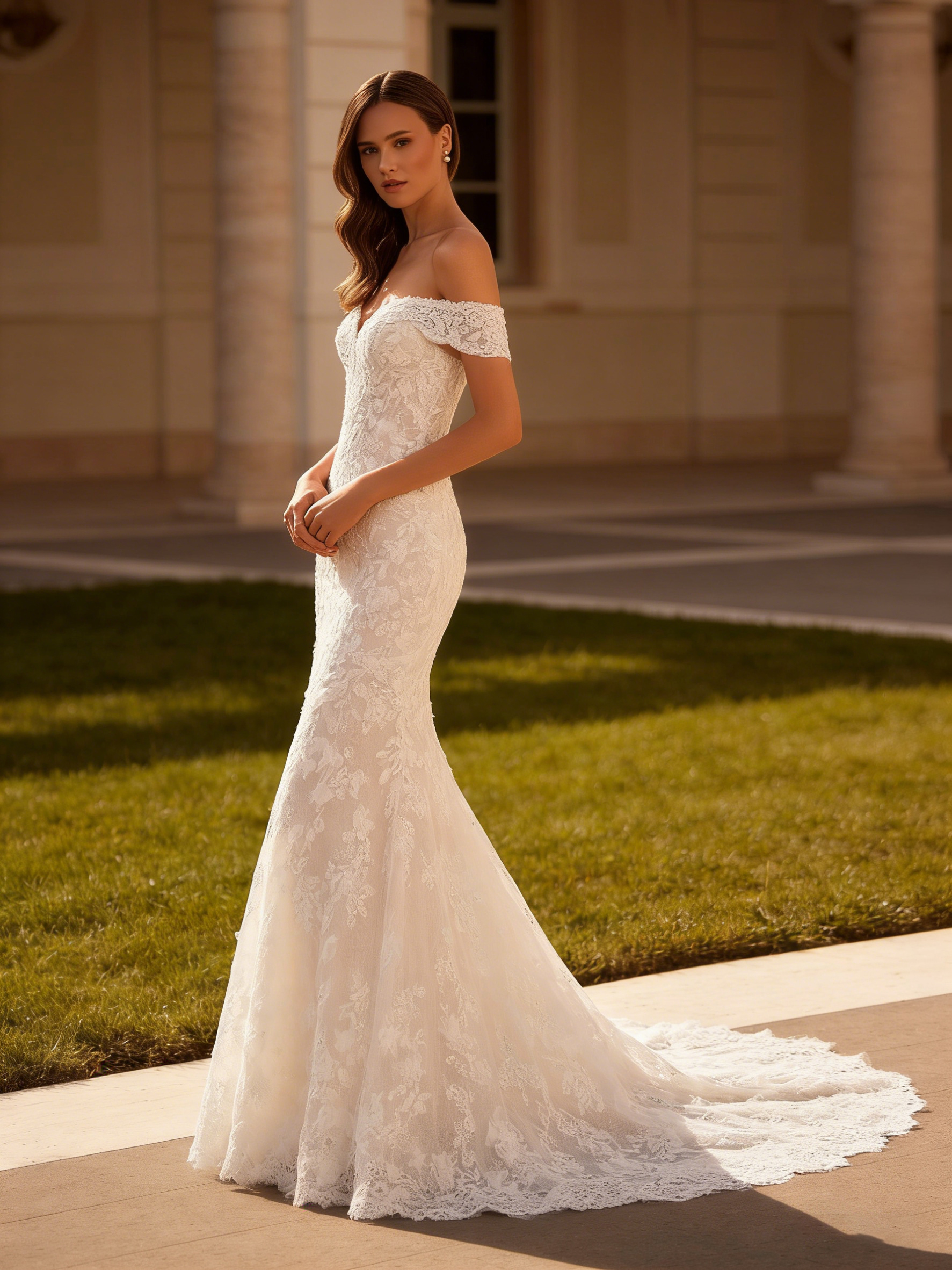 Lace Off Shoulder Long Mermaid Wedding Dress with Cathedral Train