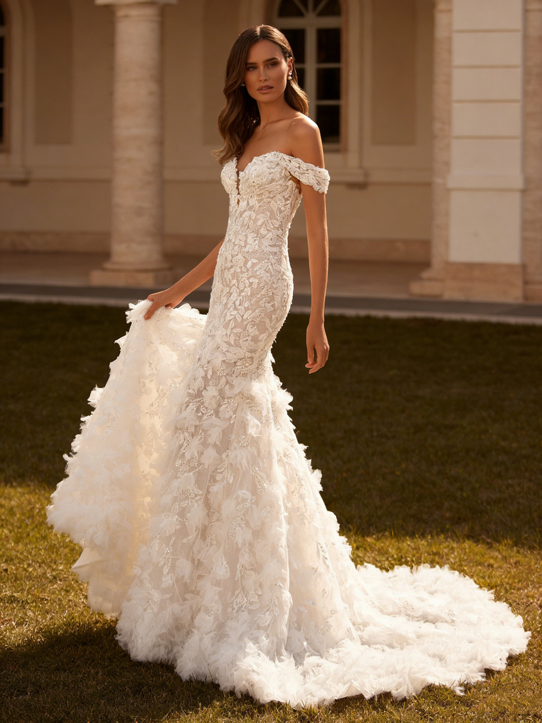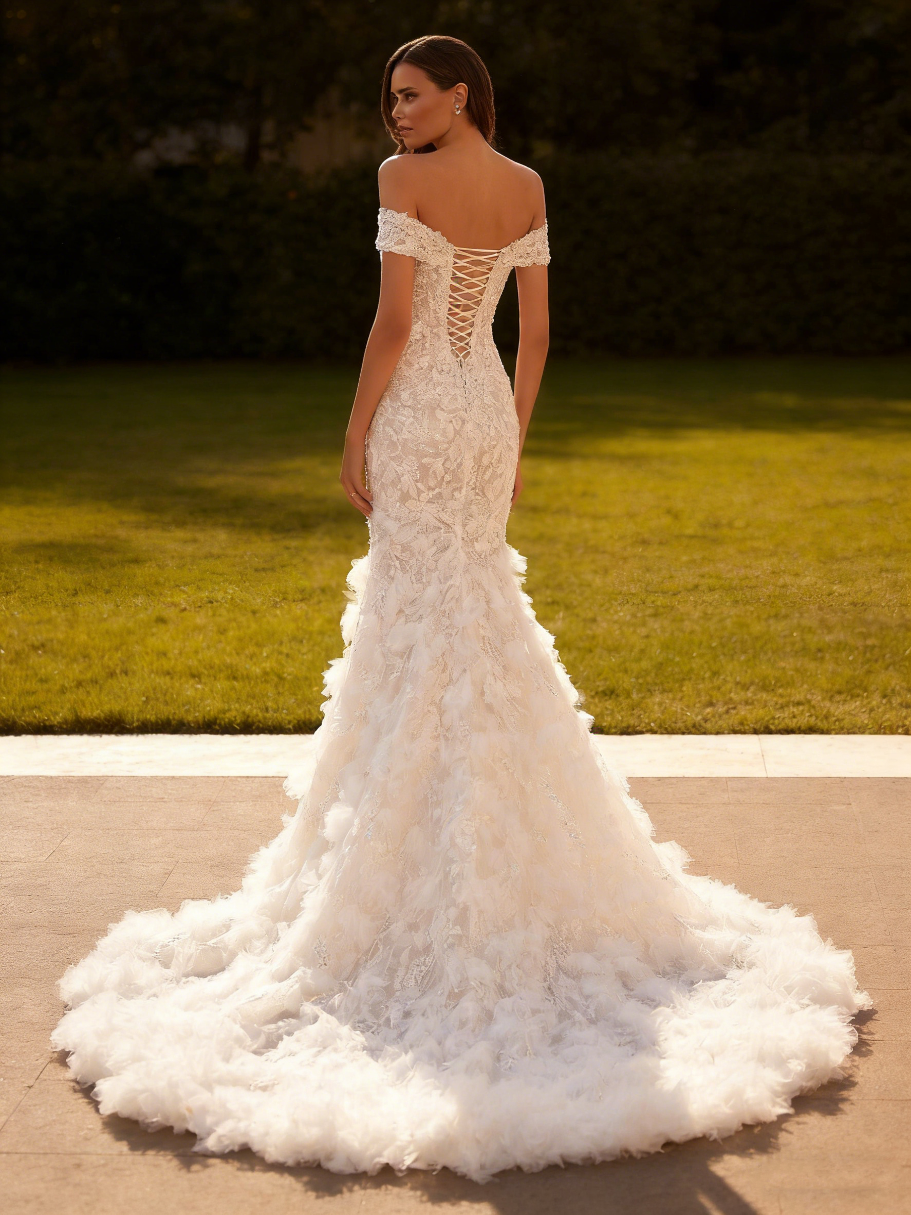 Lace & Feather Off Shoulder Long Mermaid Wedding Dress with Cathedral Train