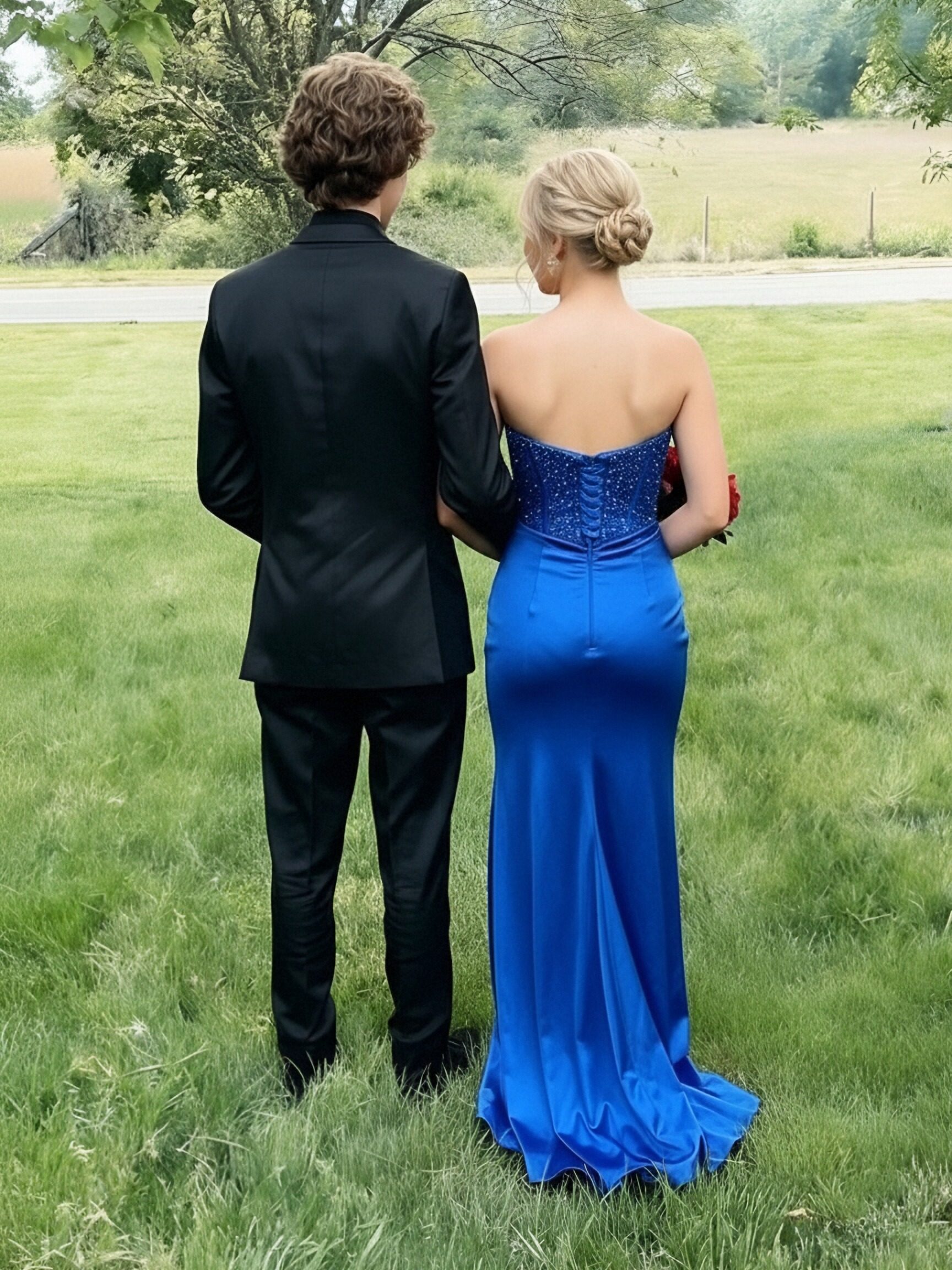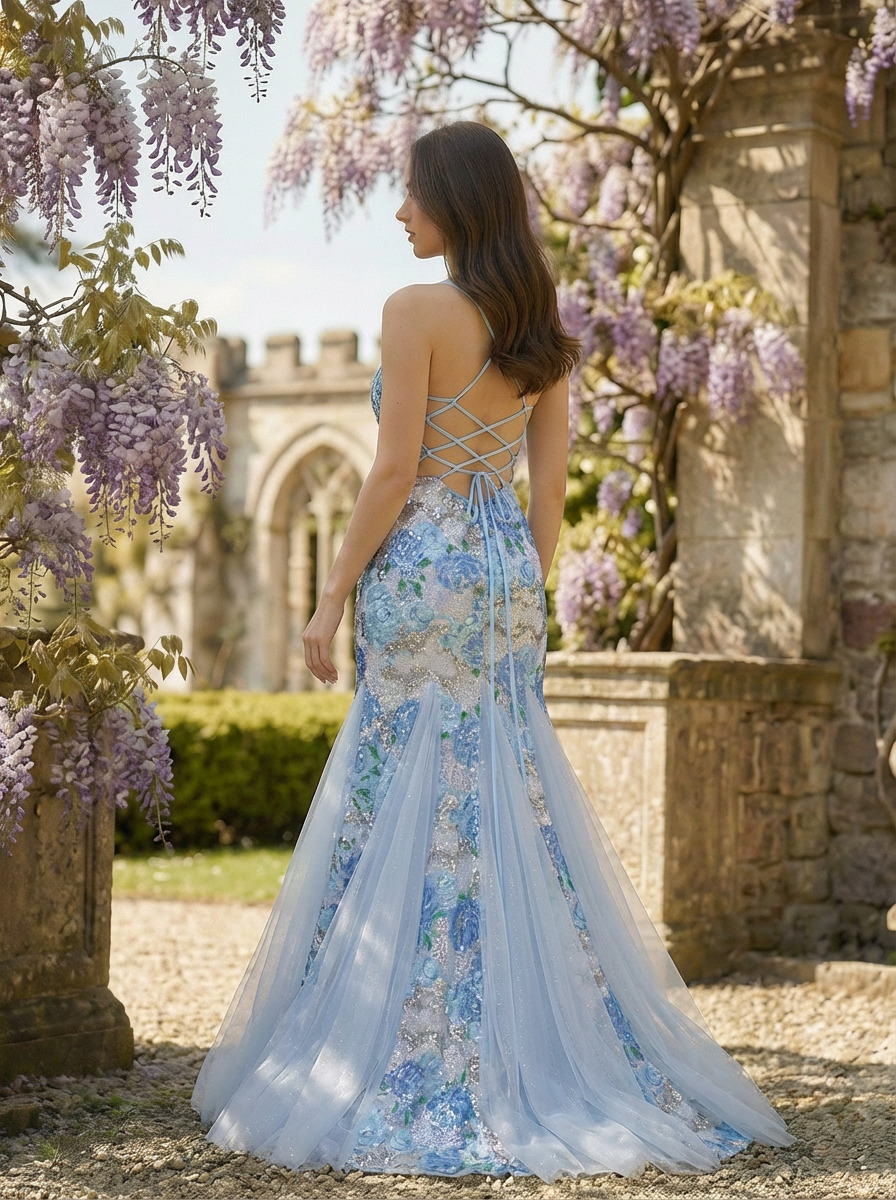 Strapless Blue Floral Corset Mermaid Prom Maxi Dresses