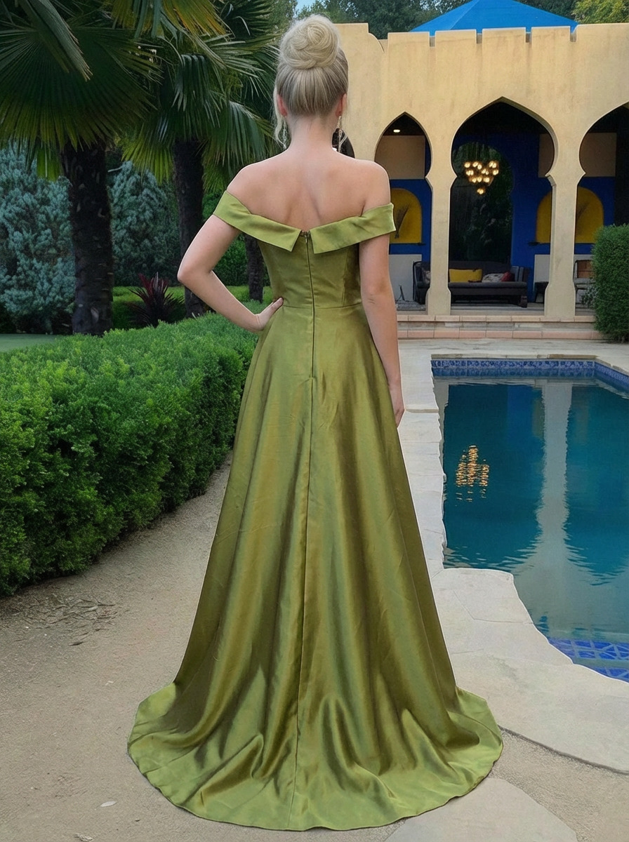Satin Off Shoulder A Line Prom Dresses with Slit