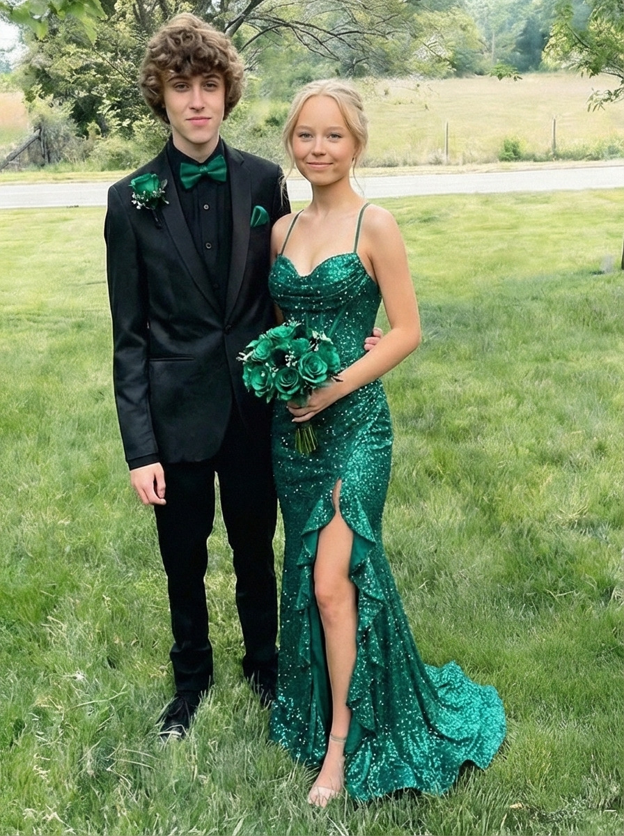 Sequin Spaghetti Straps Mermaid Prom Dresses with Bow