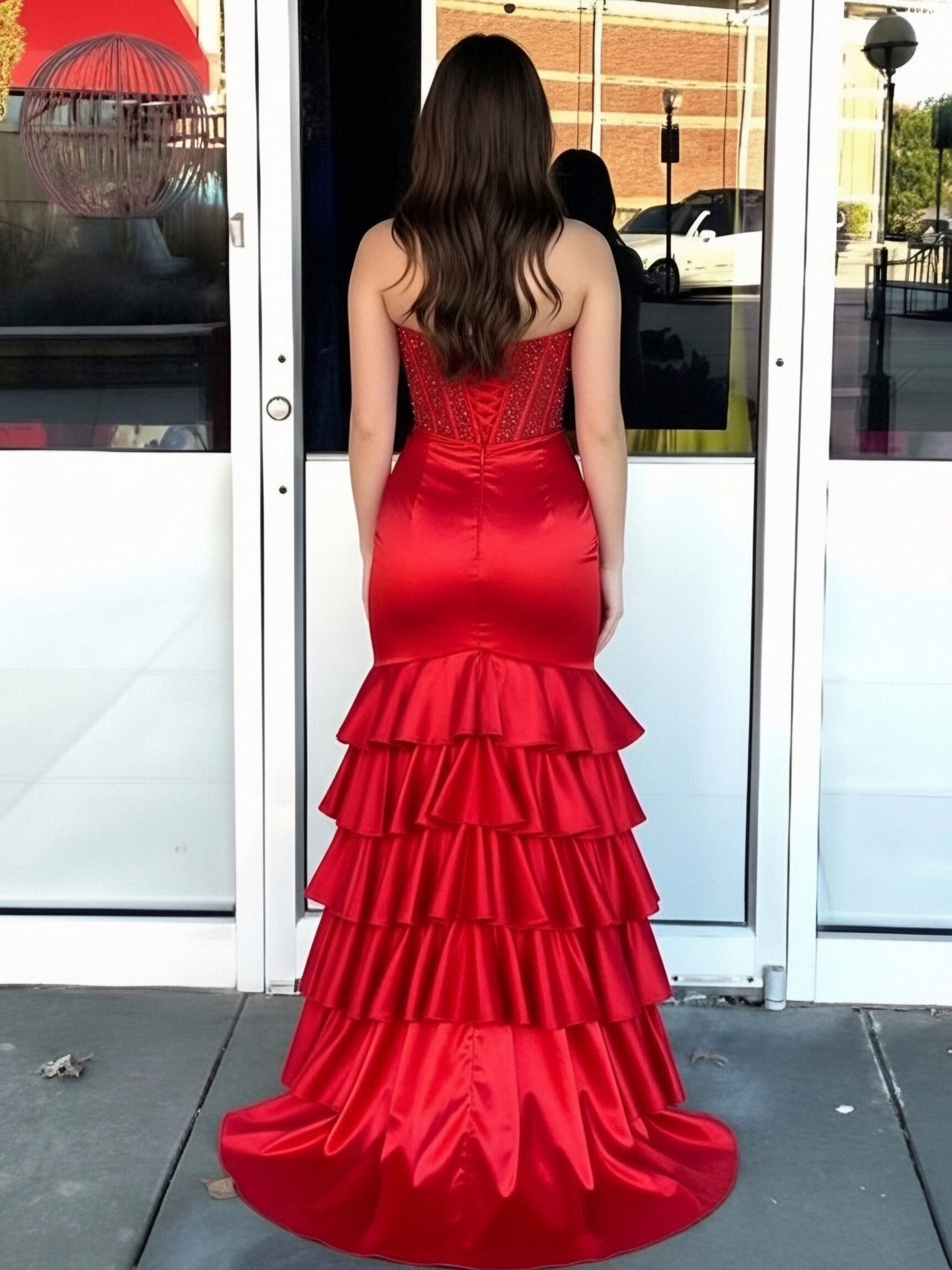 Satin Sequin Strapless Mermaid Prom Dresses with Ruffles