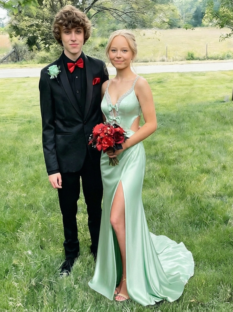 Satin Beading V Neck Mermaid Prom Dresses with Bow