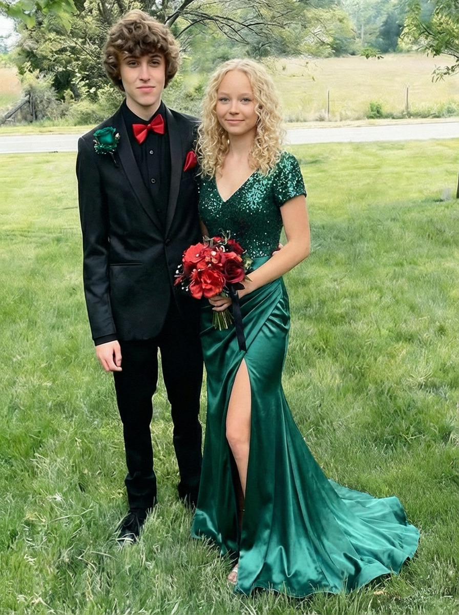 Satin Sequin V Neck Mermaid Prom Dresses with Slit