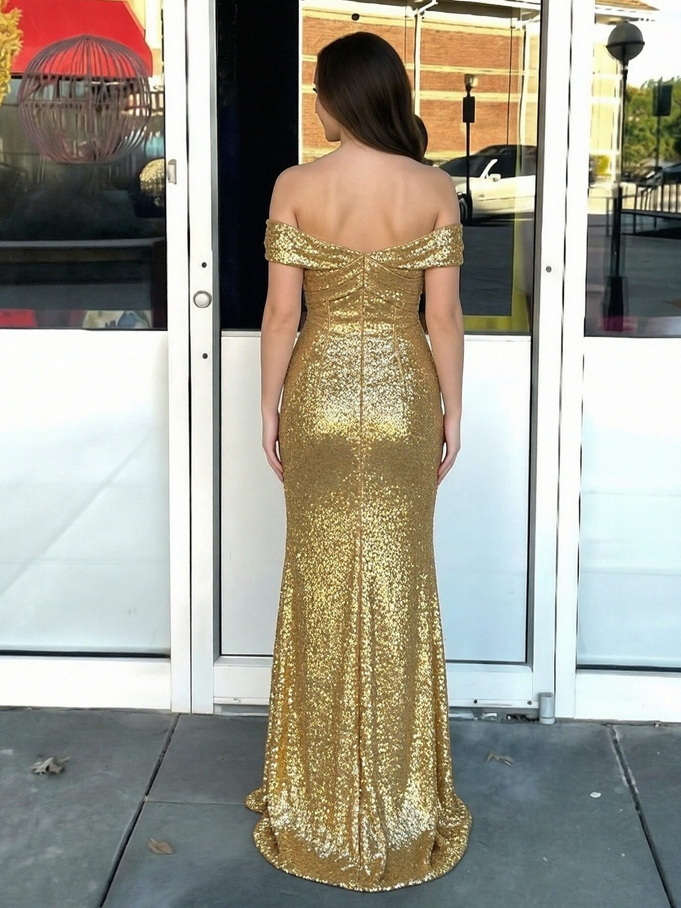 Off Shoulder Ruched Sequin Maxi Prom Dresses with Slit