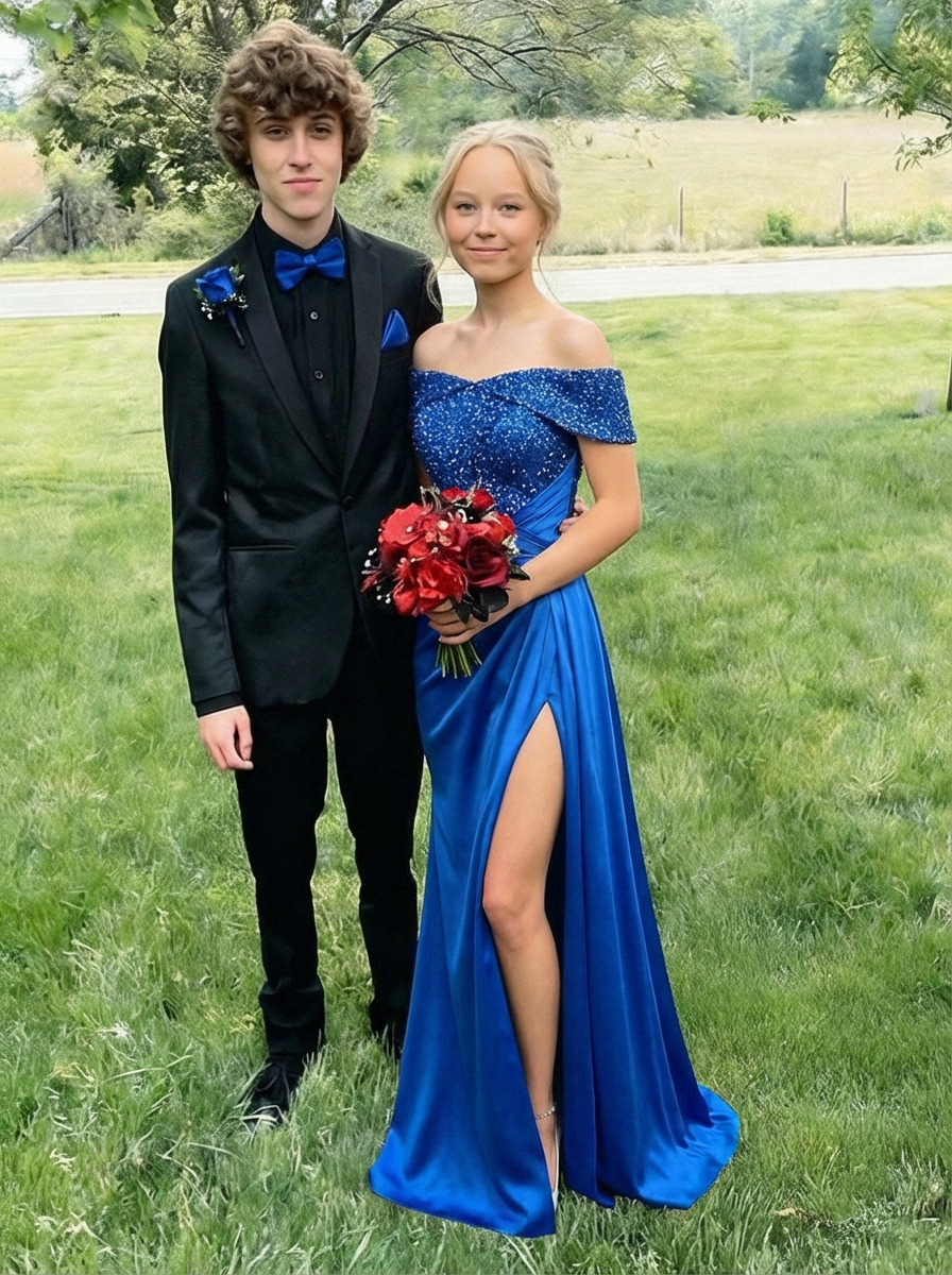 Satin Sequin Off Shoulder Mermaid Prom Dresses with Slit