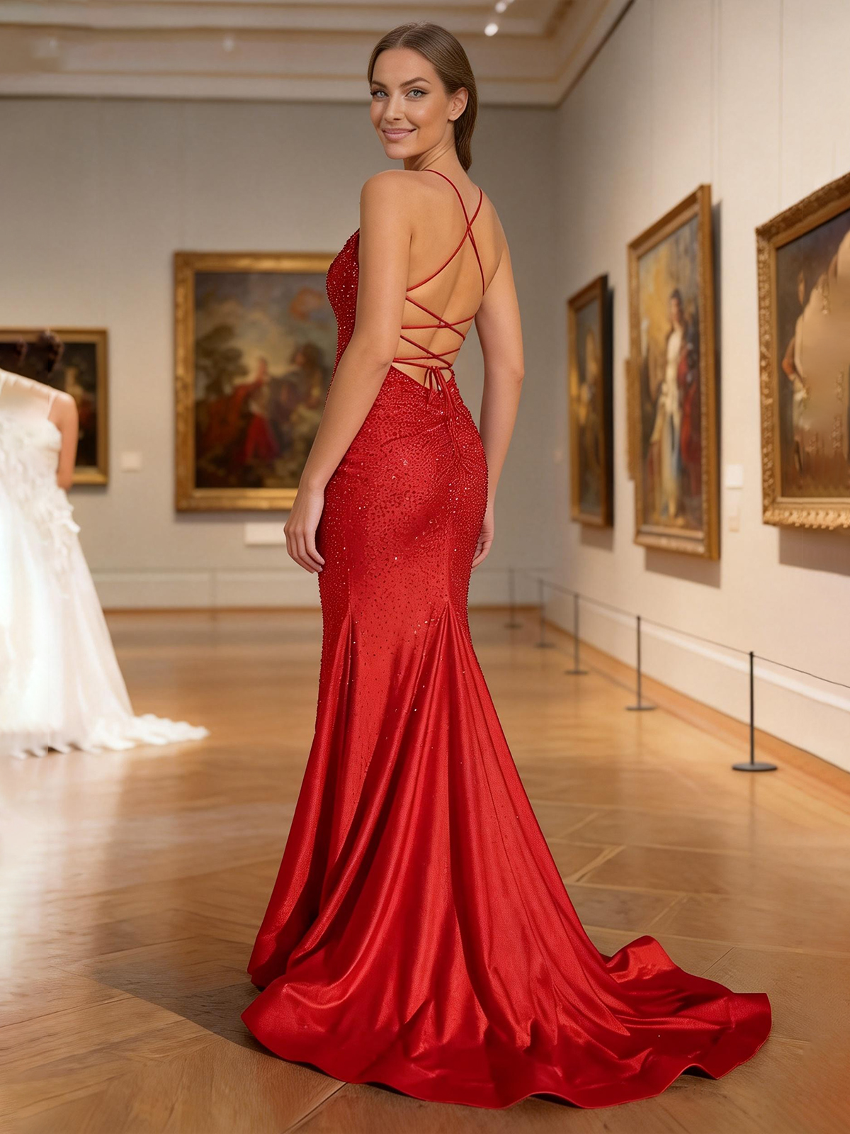 Satin Halter Long Mermaid Prom Dresses with Rhinestone