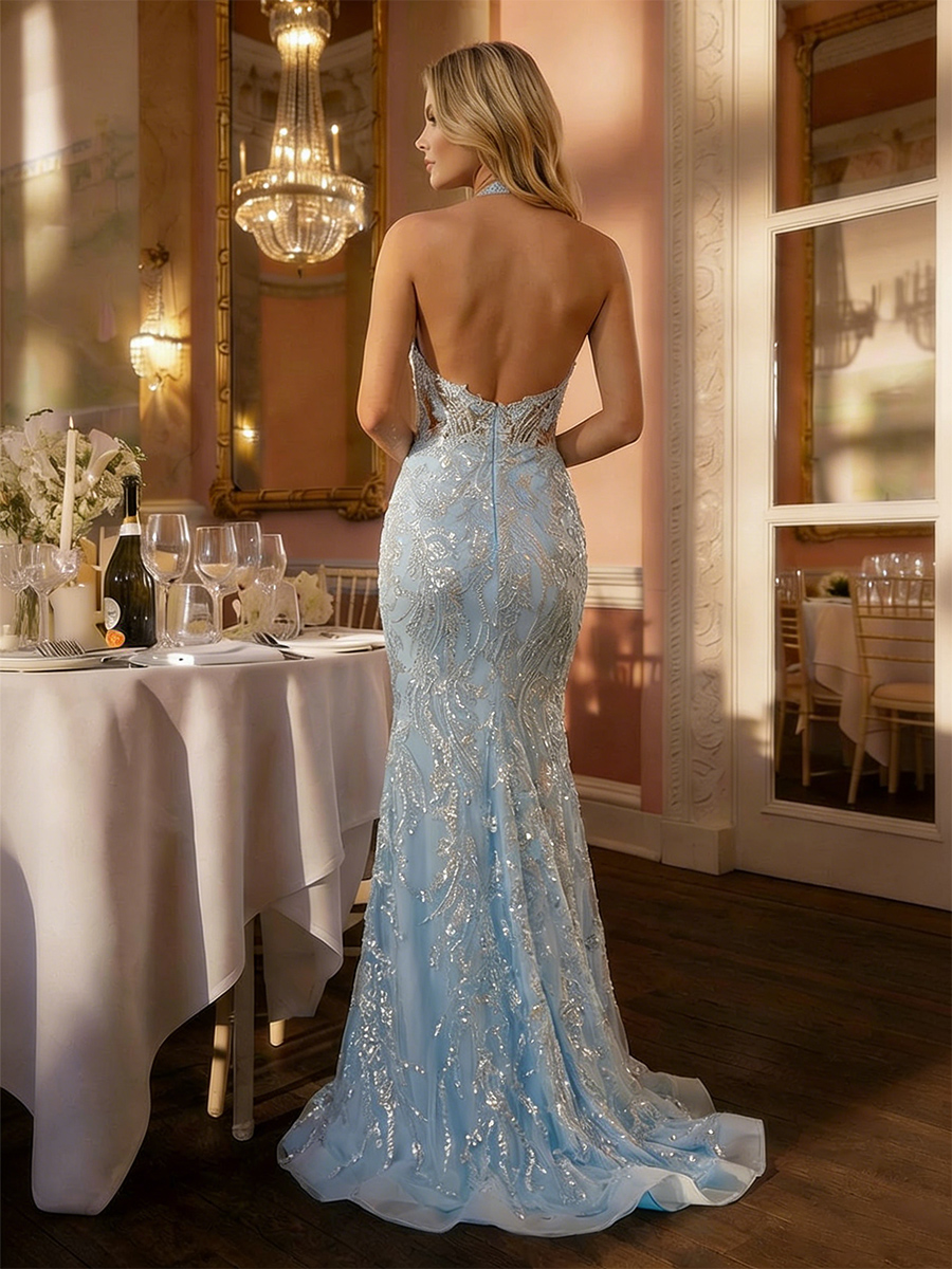 Sequin Halter Long Mermaid Prom Dresses with Backless
