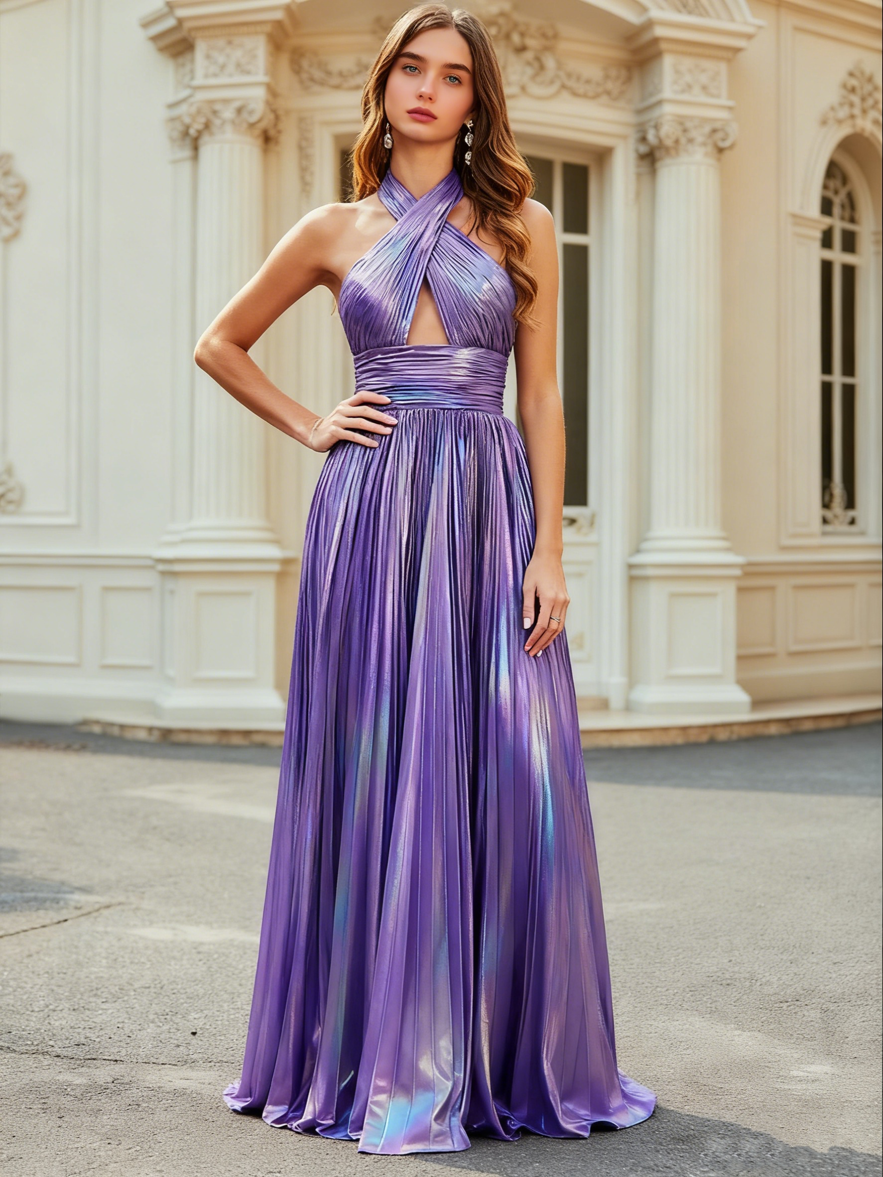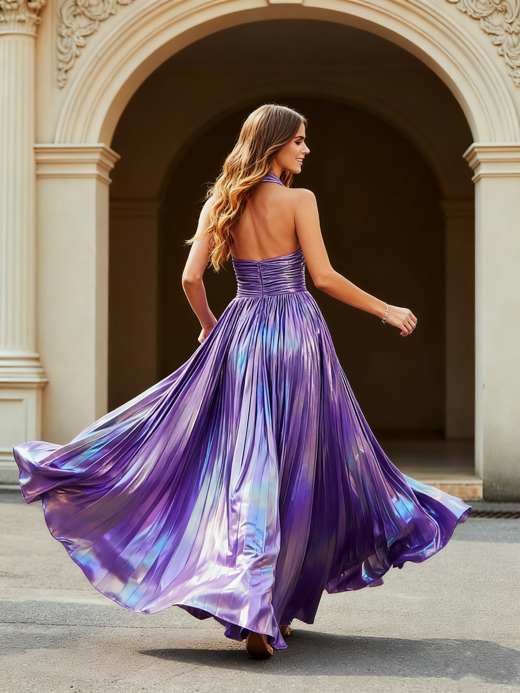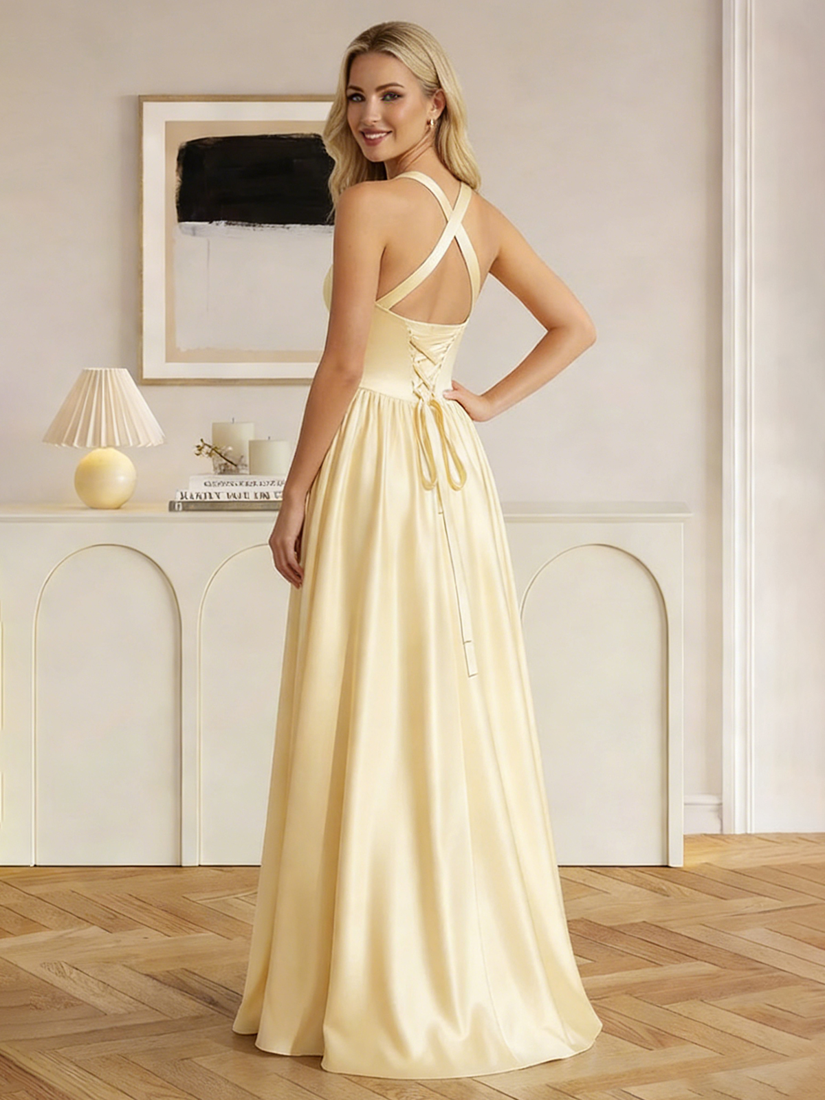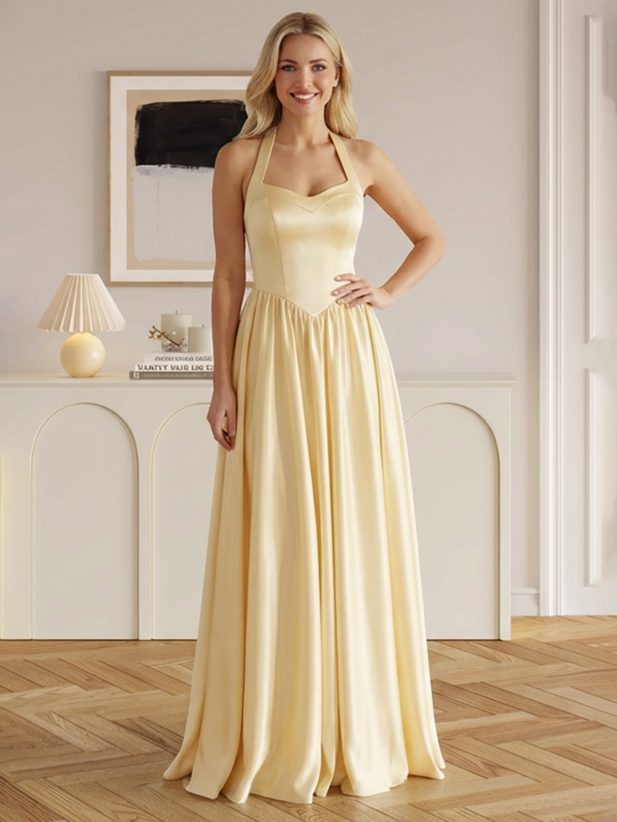 Metallic Satin Halter Long A Line Prom Dresses with Backless