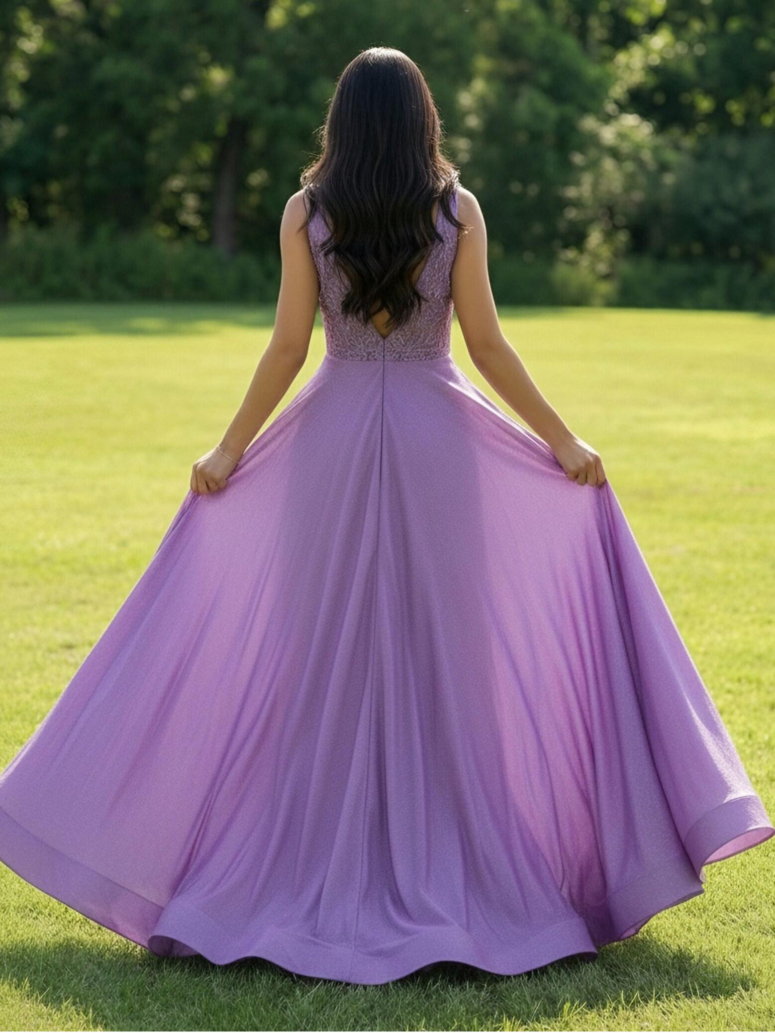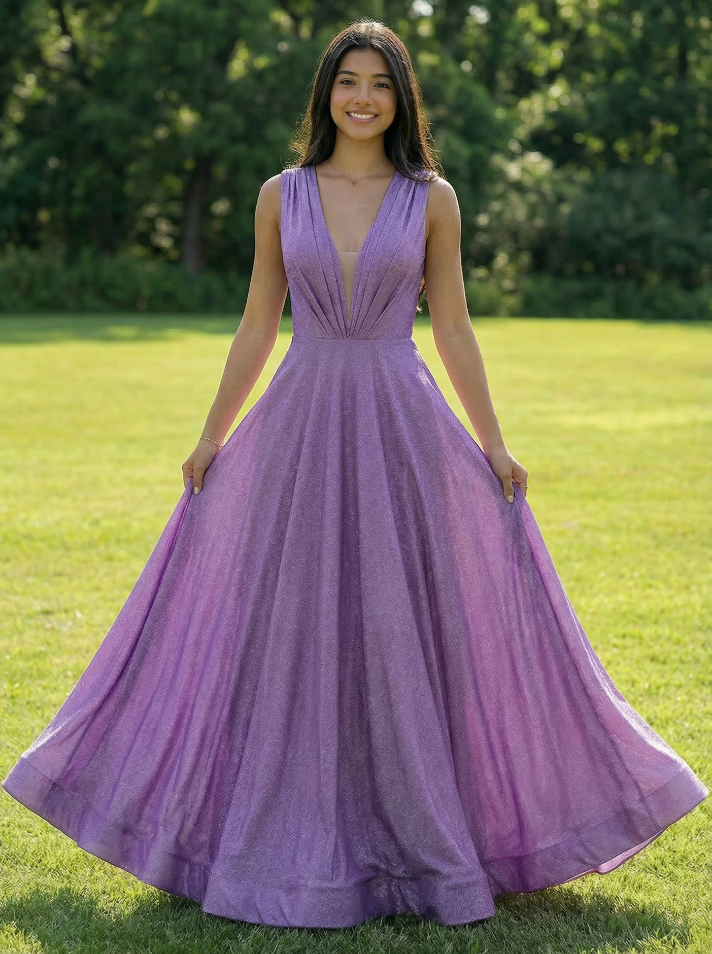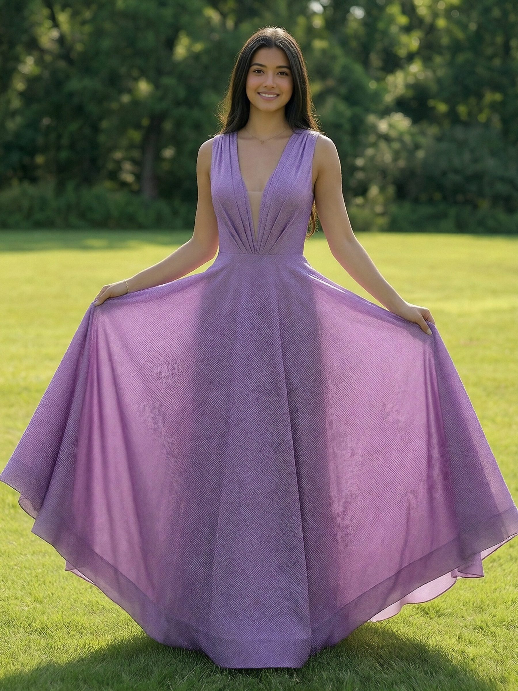 Chiffon Deep V Neck Long A Line Ball Gown with Pleats