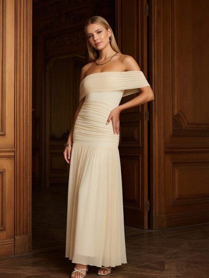 Chiffon Off Shoulder A Line Bridesmaid Dresses with Pleats