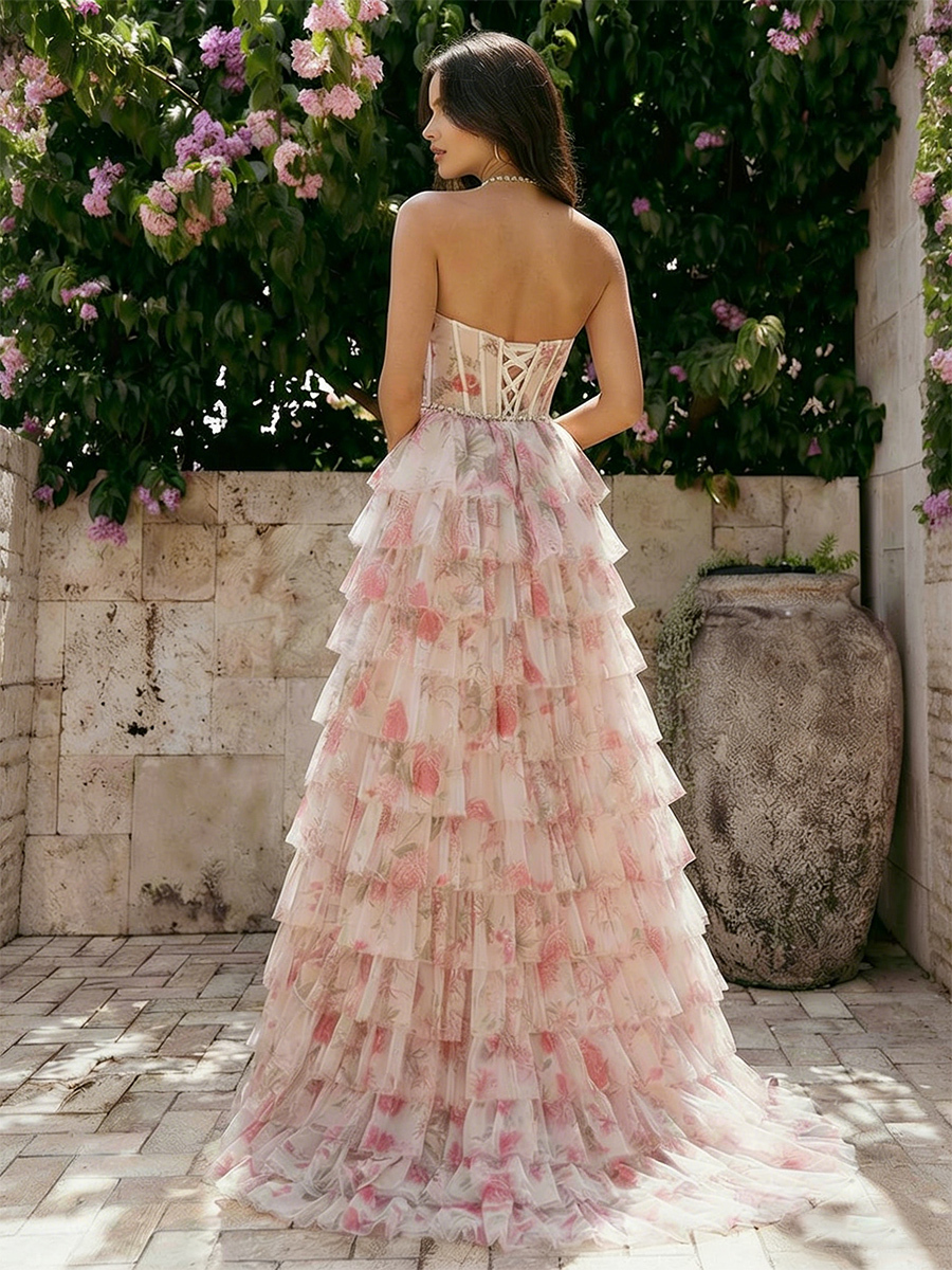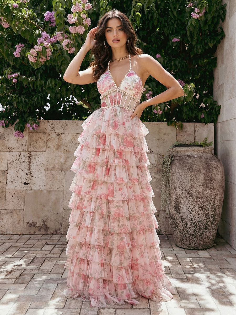 Floral Chiffon Halter Long A Line Prom Dresses with Tiered
