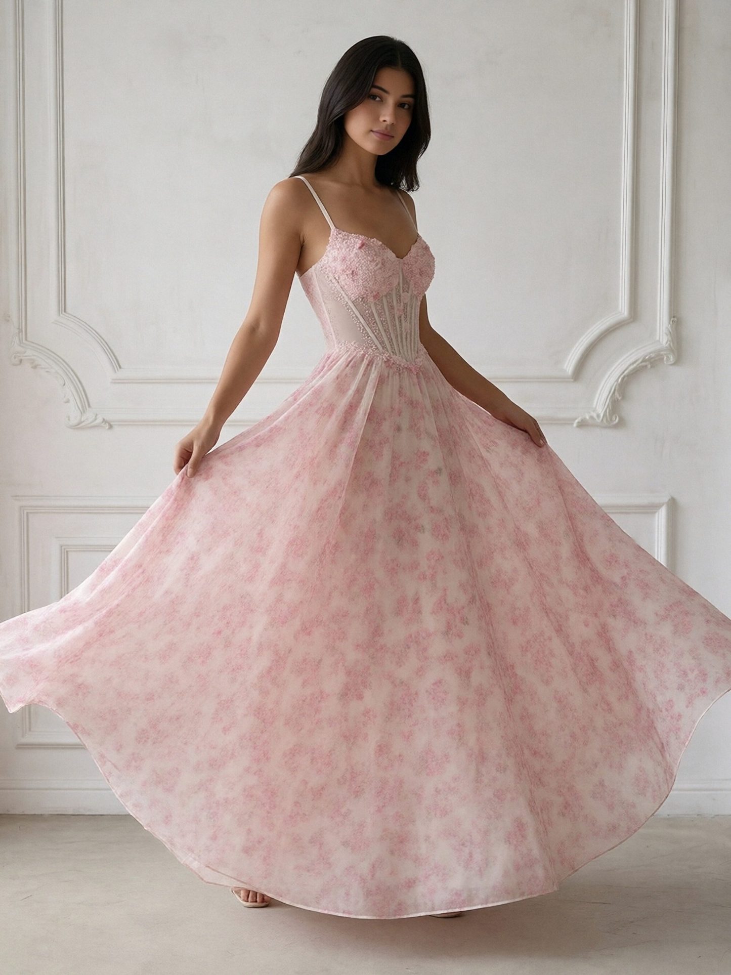 Floral Chiffon Spaghetti Straps Long A Line Ball Gown with Flower