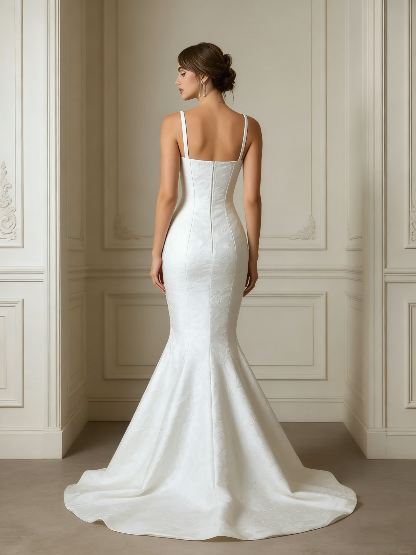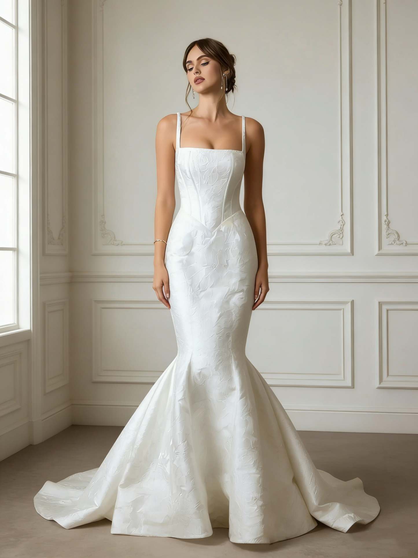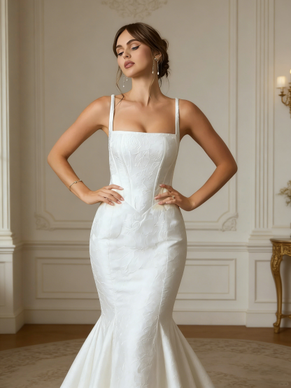 Floral Jacquard Spaghetti Straps Long Mermaid Wedding Dress with Pockets