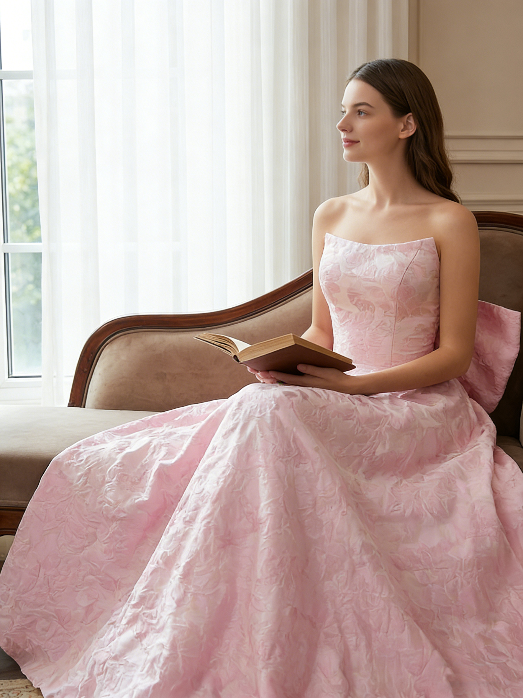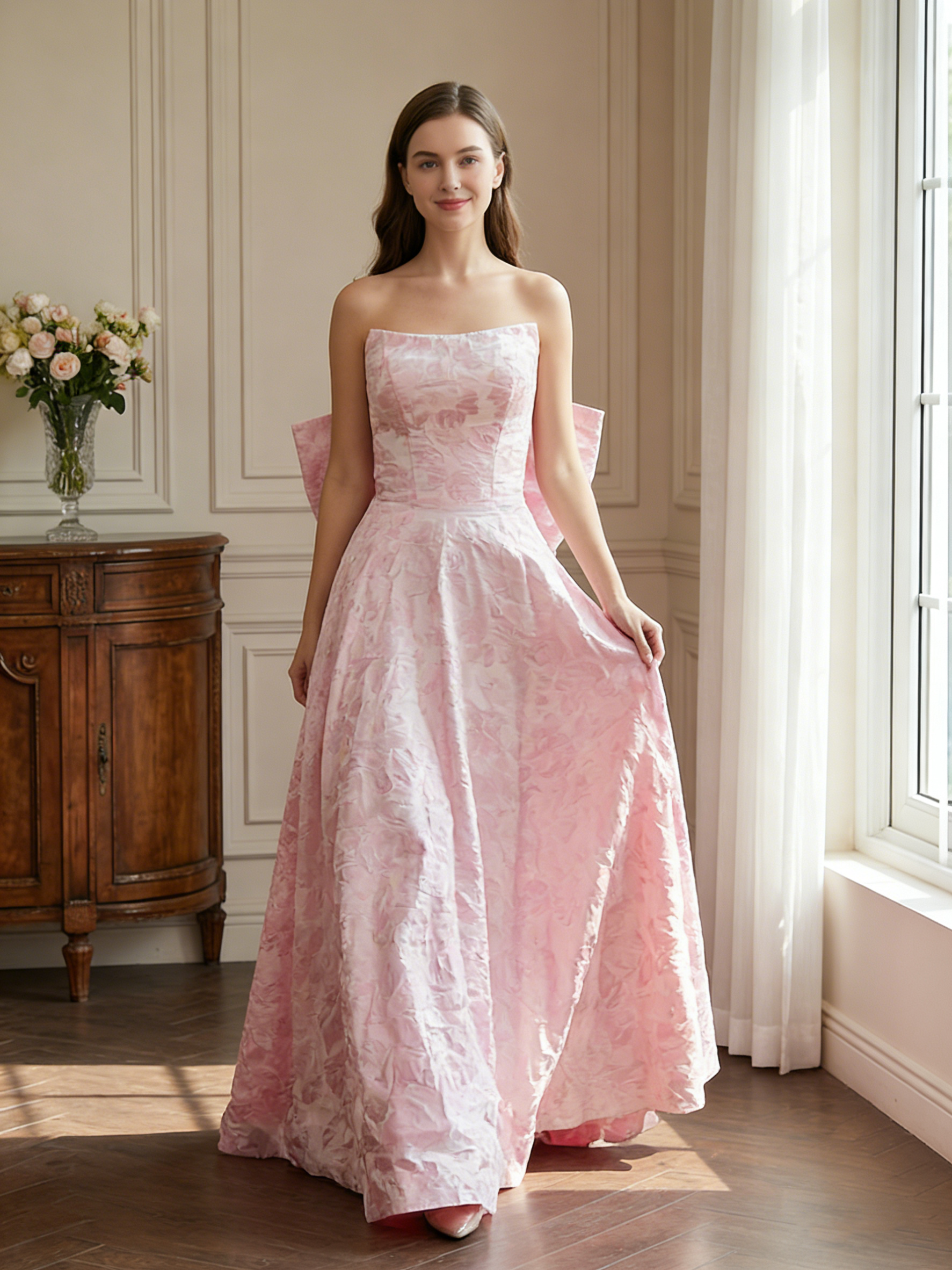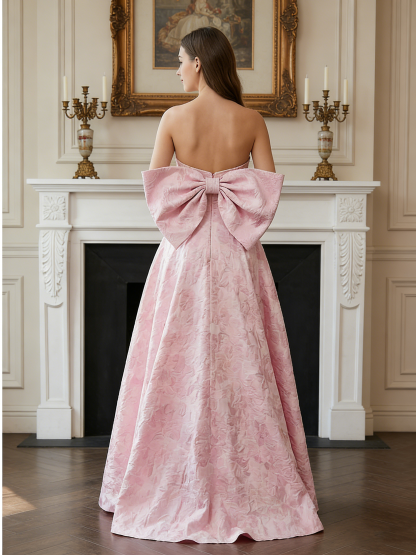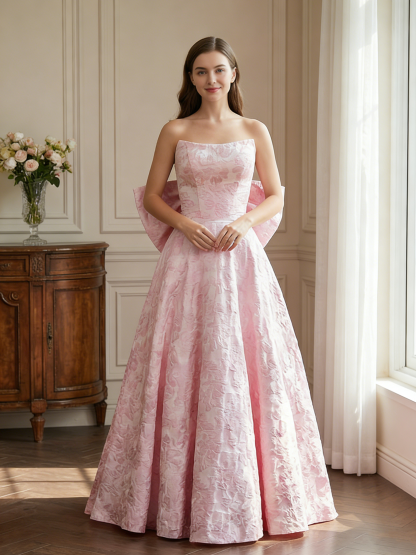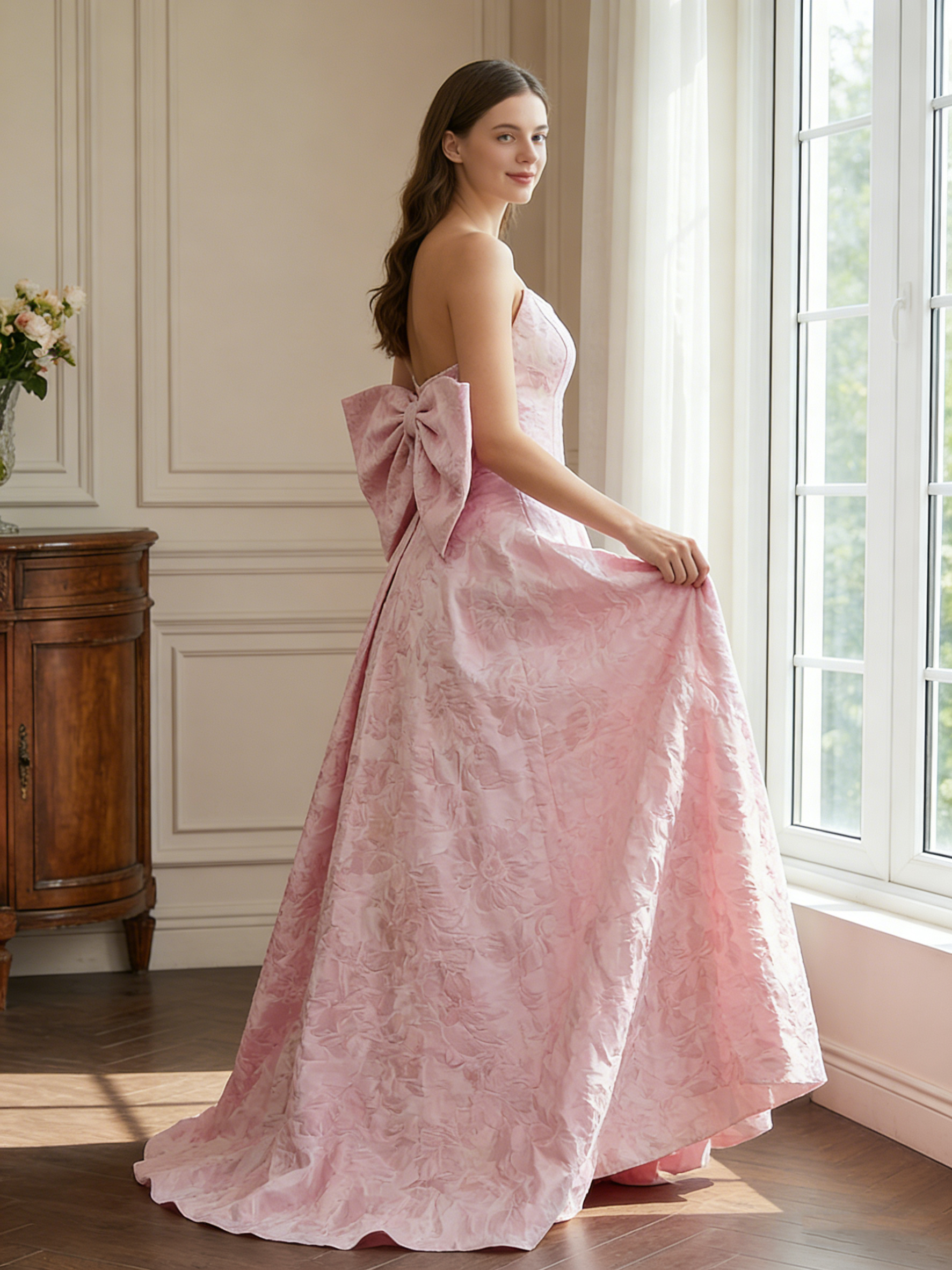 Floral Jacquard Strapless Long A Line Prom Dresses with Bow