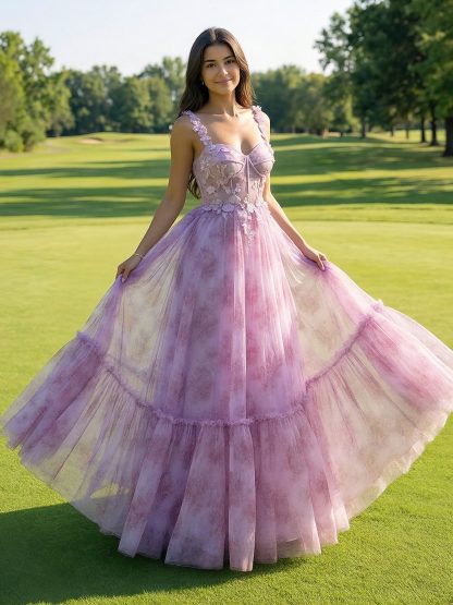 Floral Tulle Spaghetti Straps Long A Line Ball Gown with 3D Flower