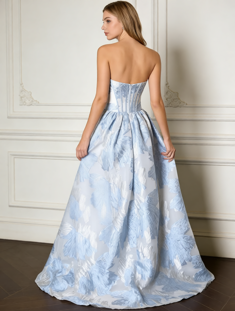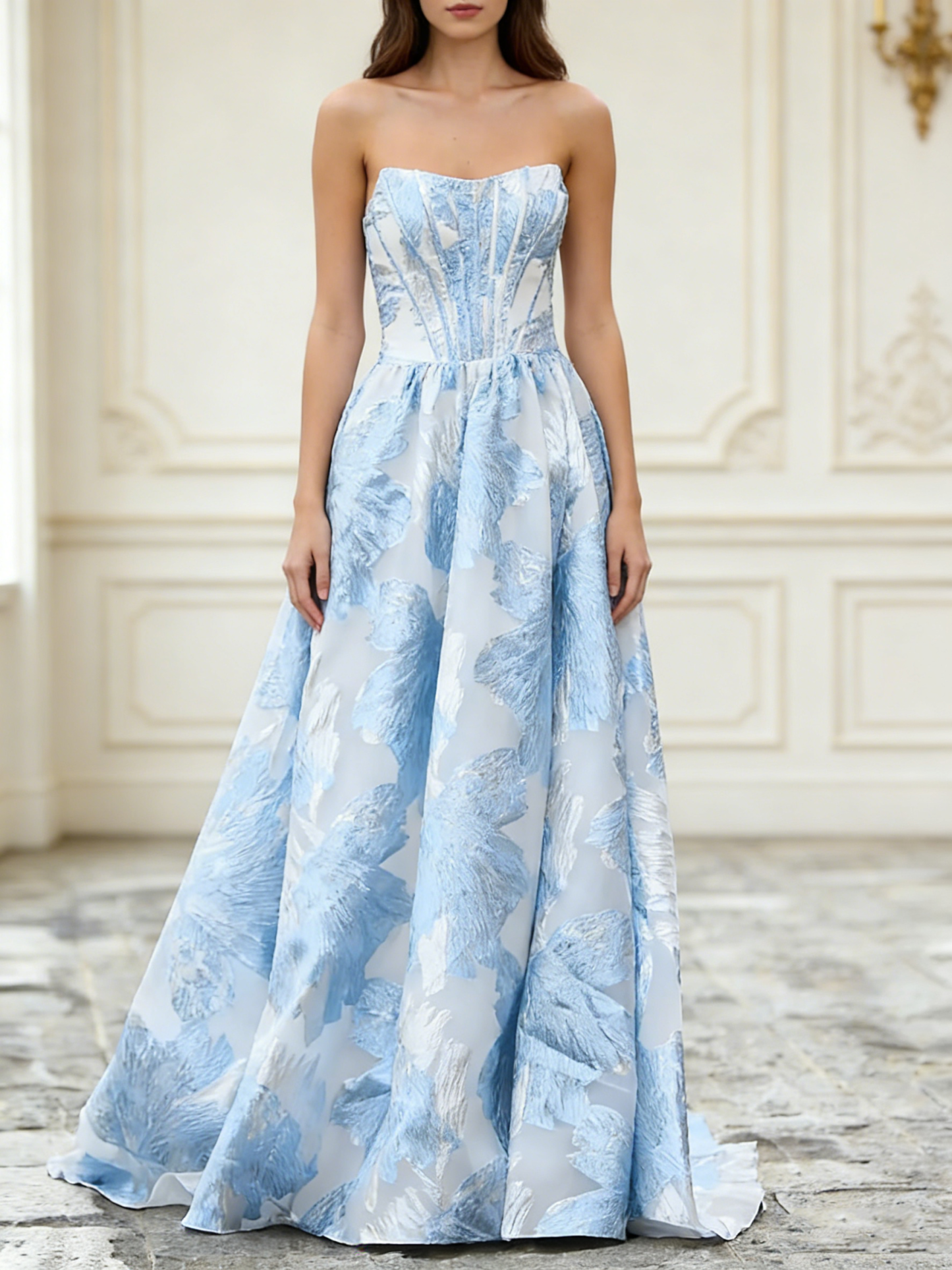 Jacquard Strapless Long A Line Prom Dresses with Backless Design