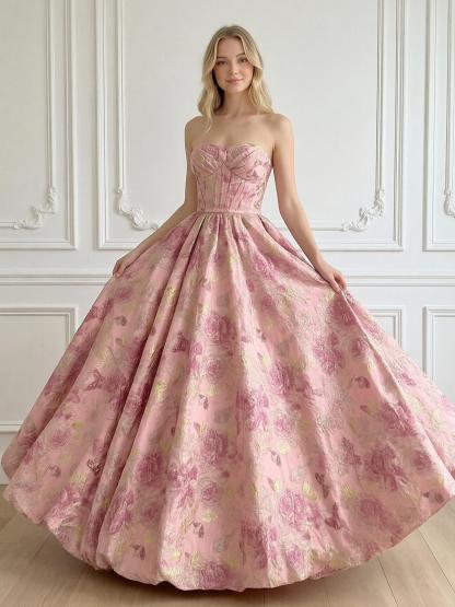 Jaqaurd Satin Strapless Long A Line Ball Gown with Pleats