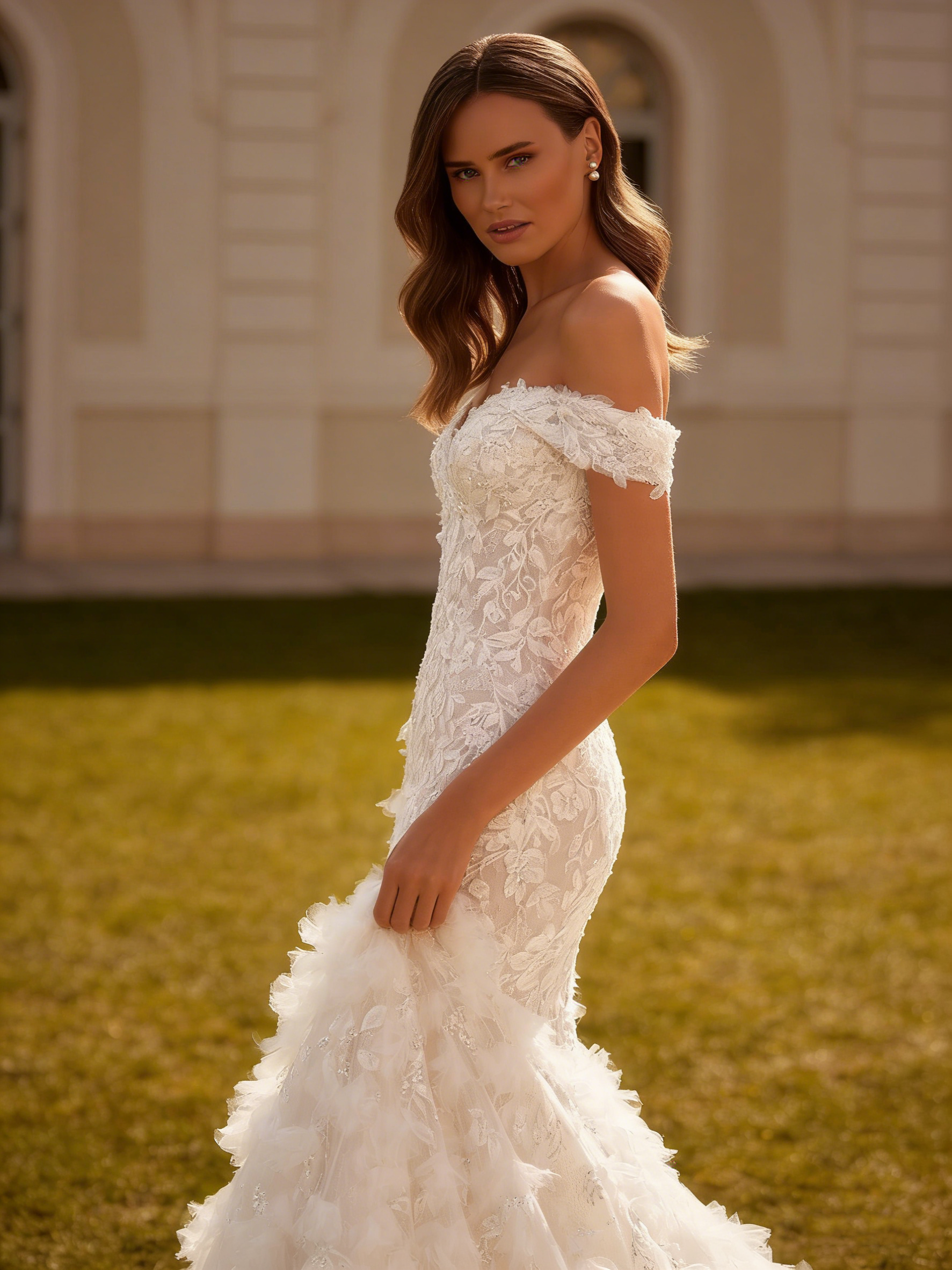 Lace & Feather Off Shoulder Long Mermaid Wedding Dress with Cathedral Train