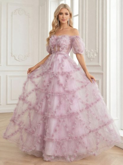 Lace Chiffon Off Shoulder Long A Line Ball Gown with Flower
