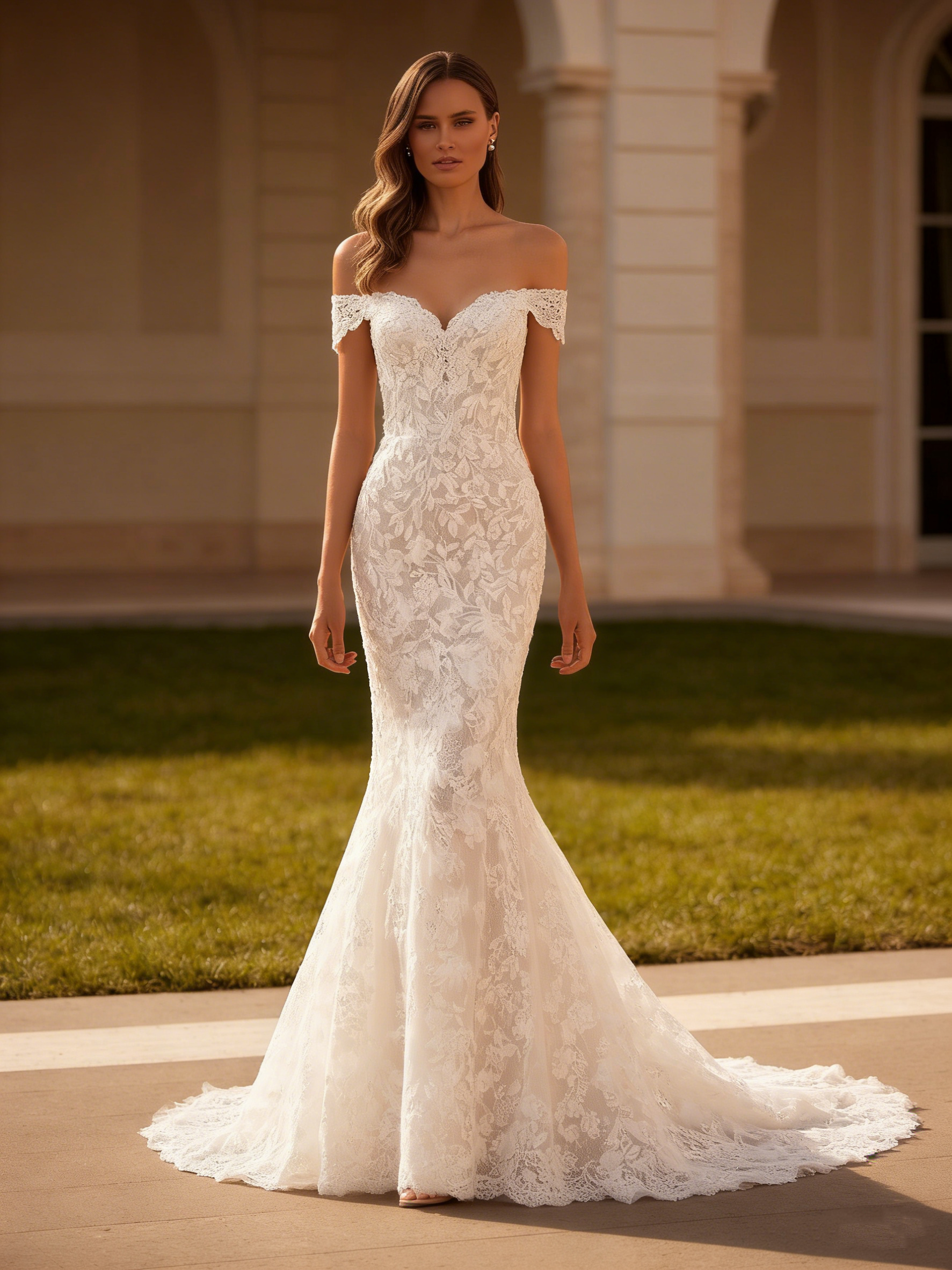 Lace Off Shoulder Long Mermaid Wedding Dress with Cathedral Train