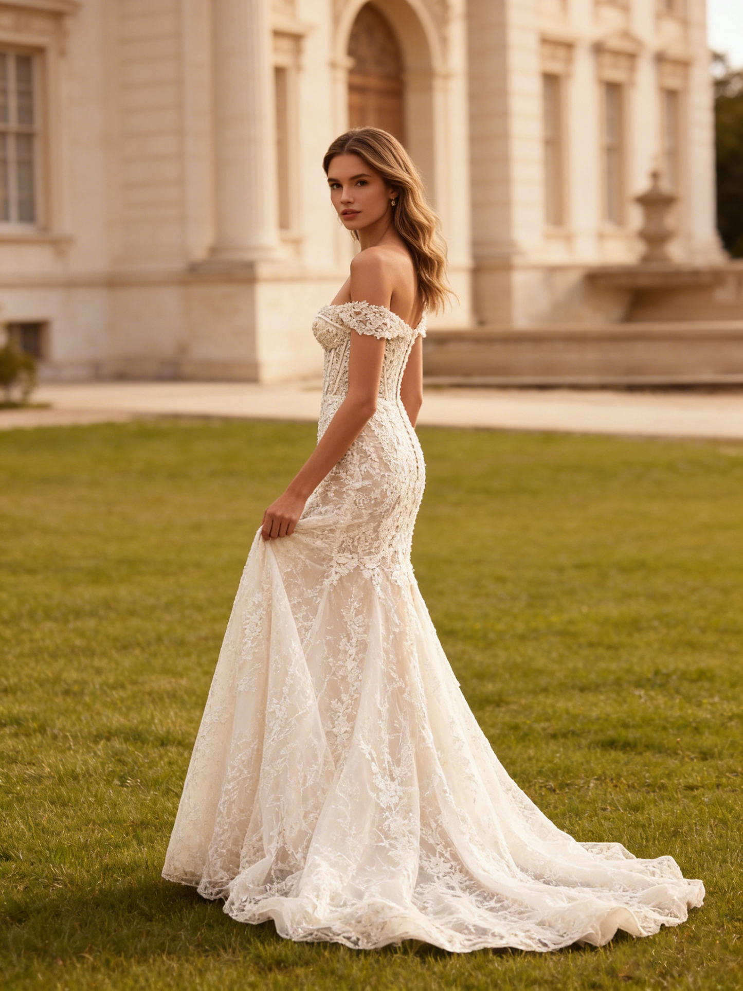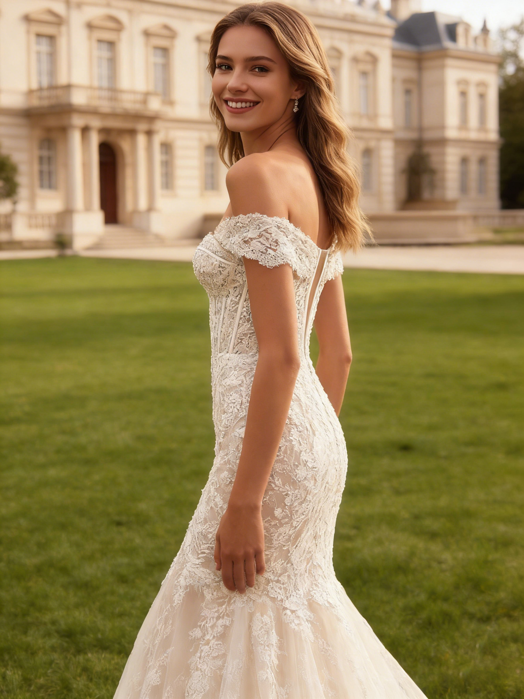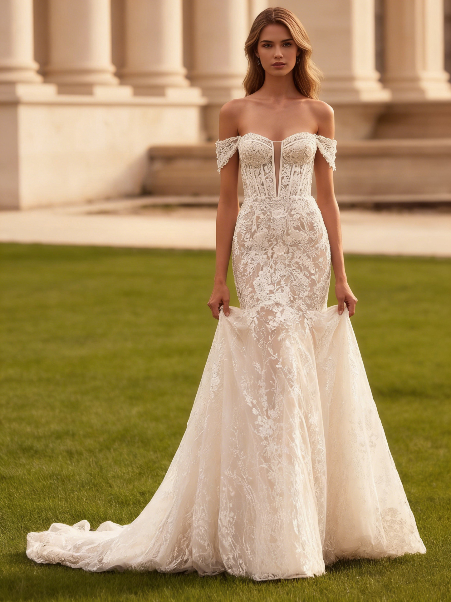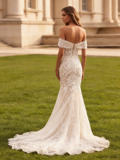 Lace Off Shoulder Long Mermaid Wedding Dress with Floral Applique