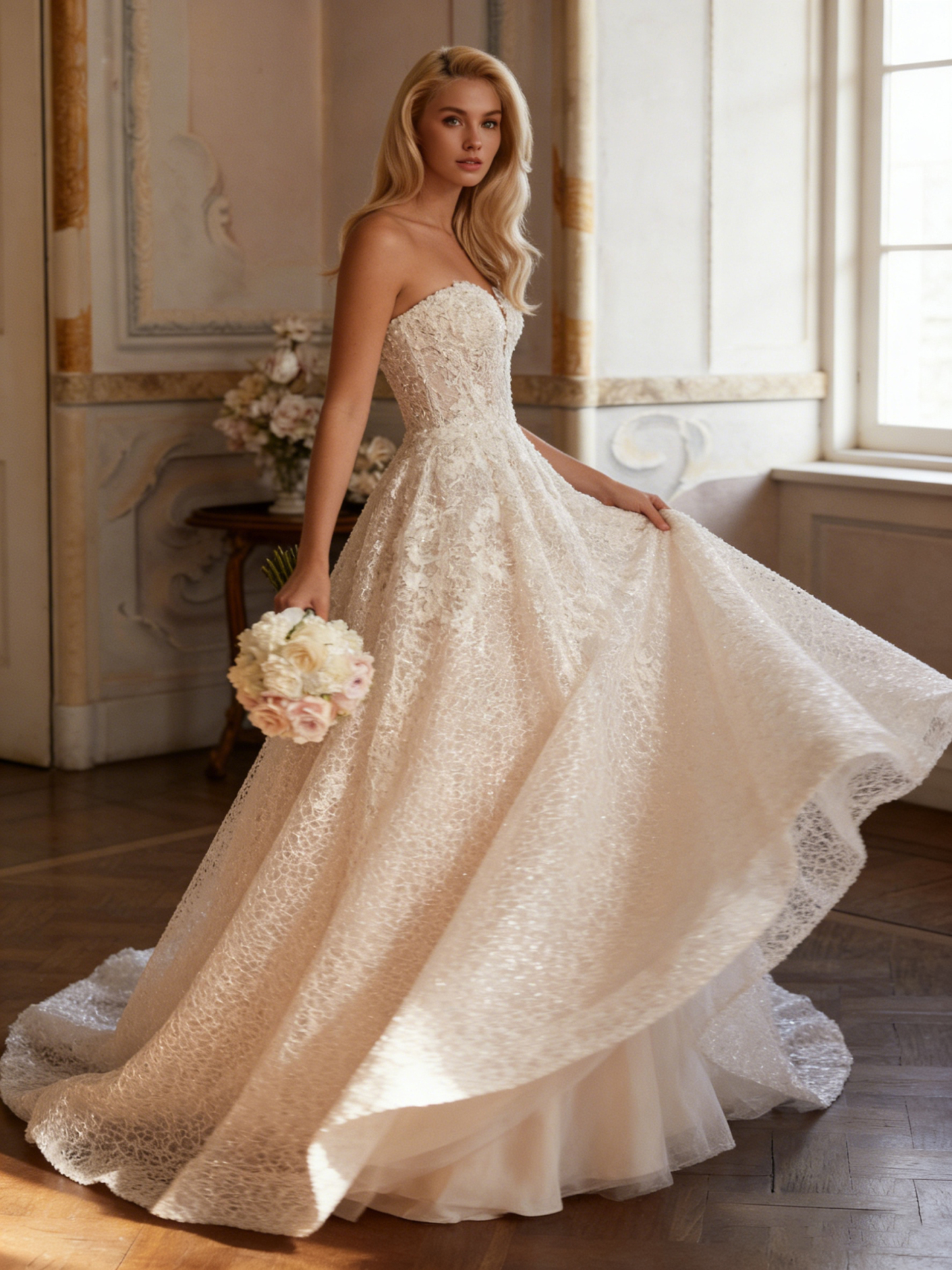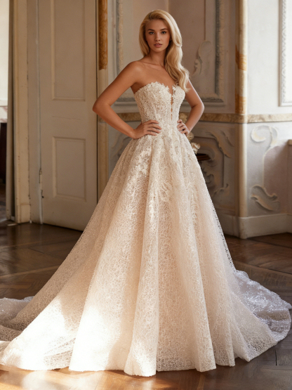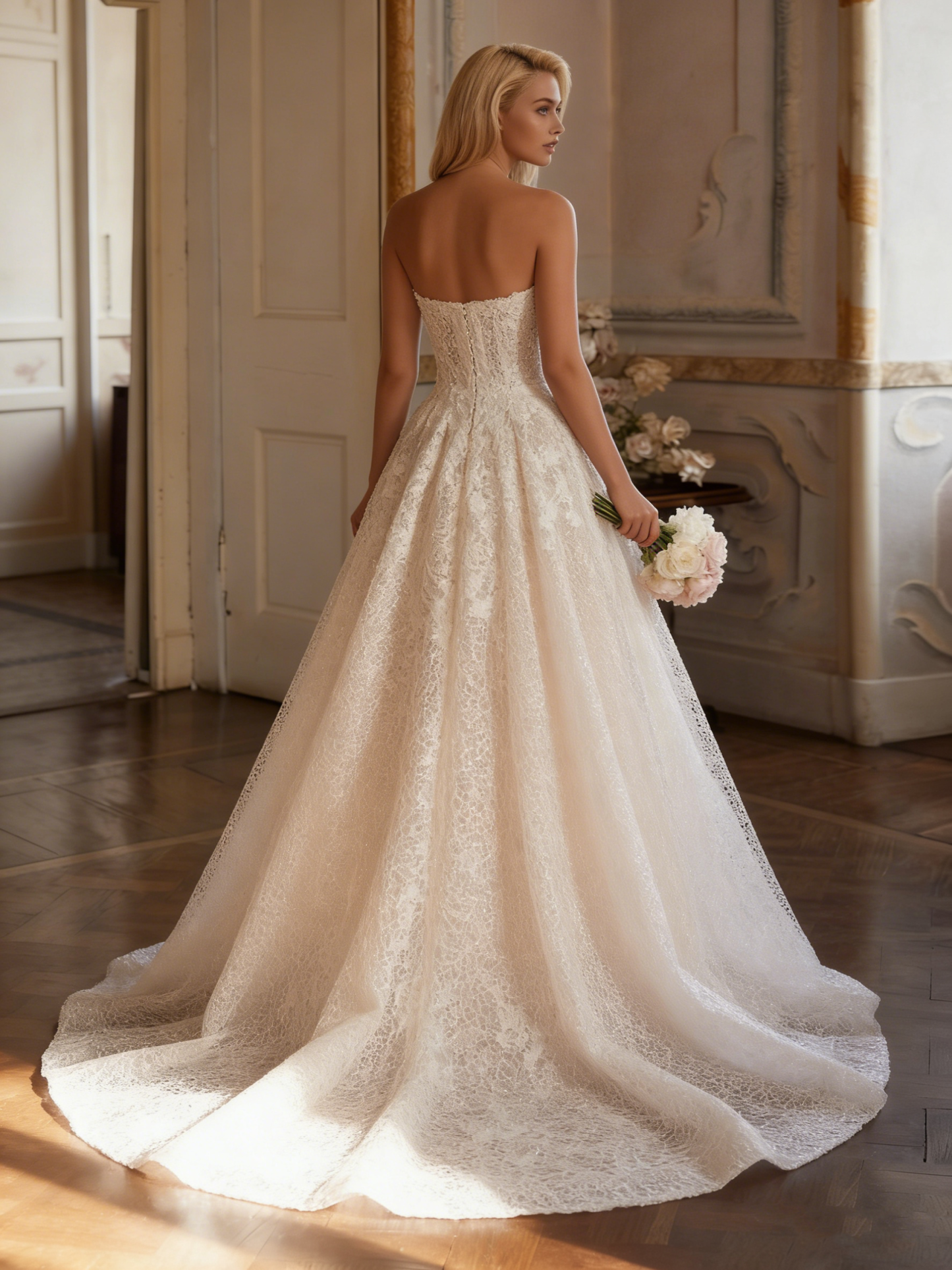 Lace Strapless Long A Line Wedding Dress with Cathedral Train