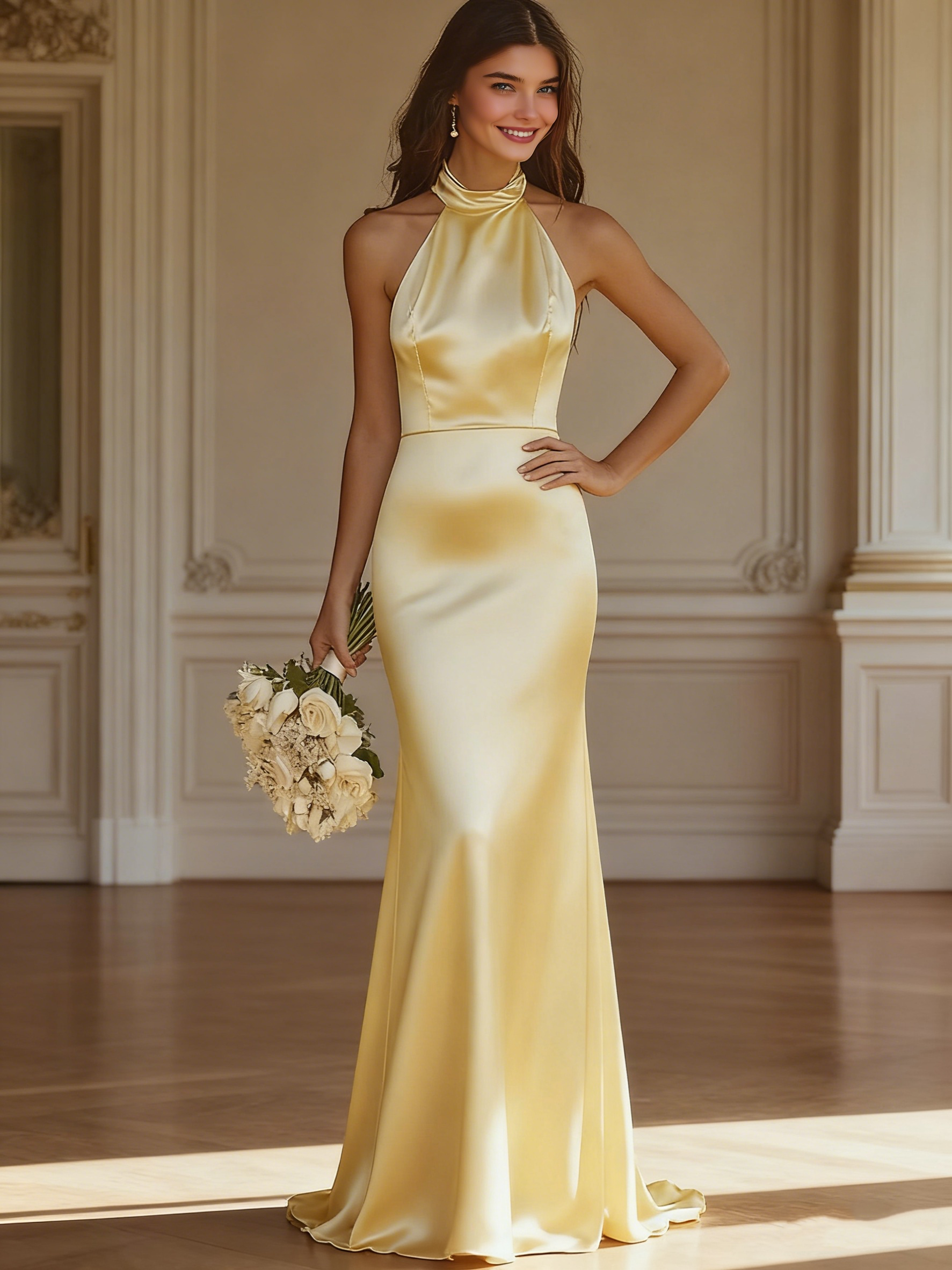 Satin Halter Long Mermaid Prom Dresses with Backless