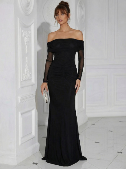 Satin Off Shoulder Long Formal Dresses with Backless Design