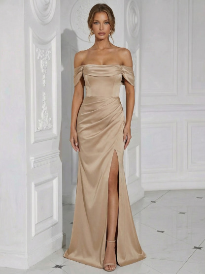 Satin Off Shoulder Long Formal Dresses with Pleats