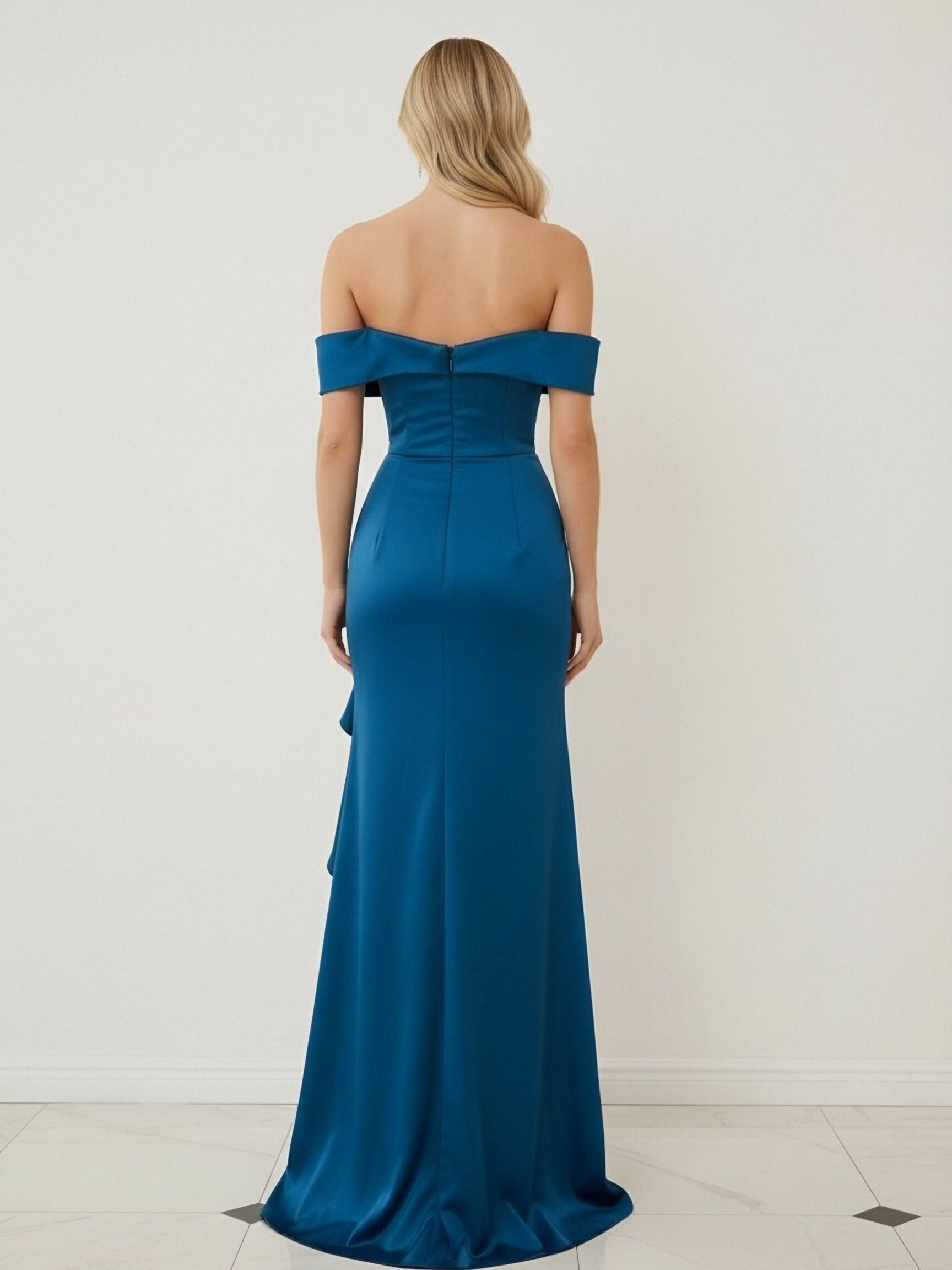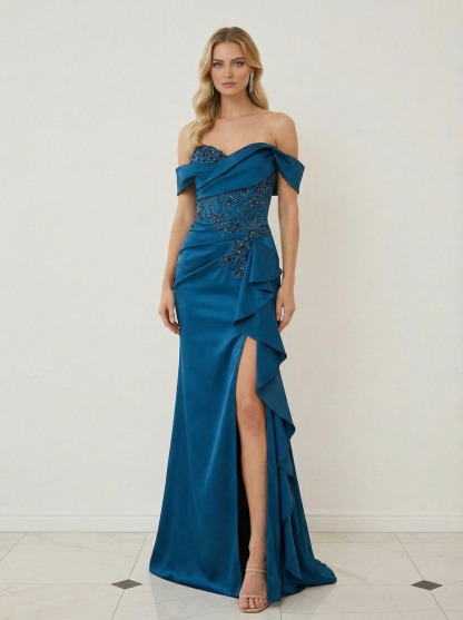 Satin Off Shoulder Mermaid Prom Dresses with Applique