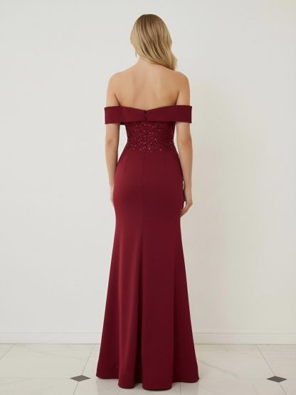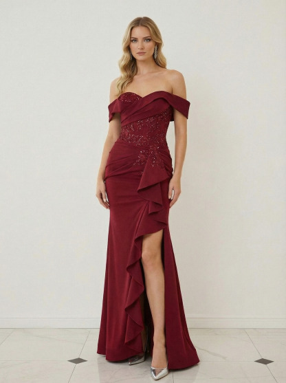 Satin Off Shoulder Mermaid Prom Dresses with Ruffles