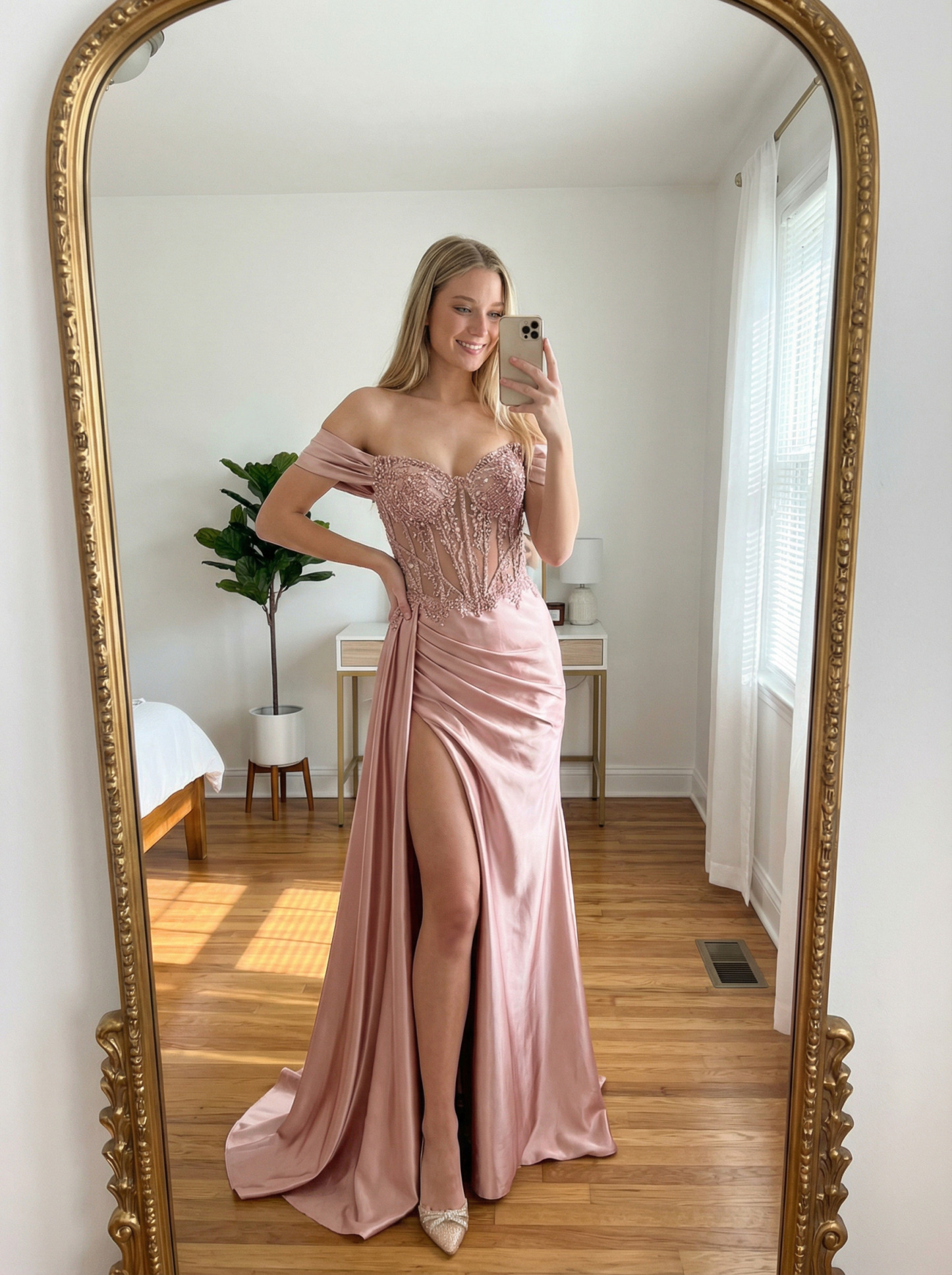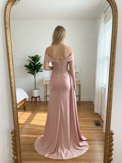 Satin Off Shoulder Mermaid Prom Dresses with Slit