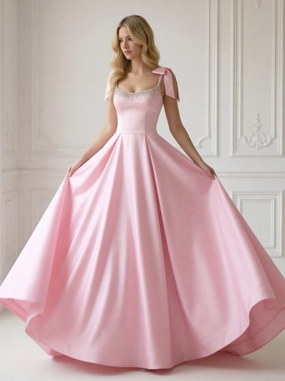 Satin Spaghetti Straps Long A Line Ball Gown with Bow