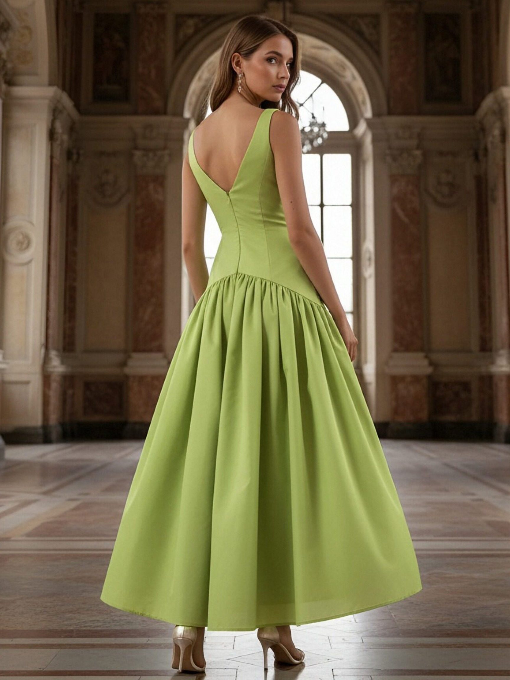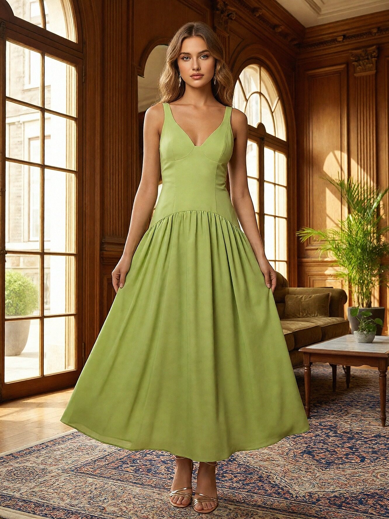 Satin V Neck A Line Bridesmaid Dresses with Pleated