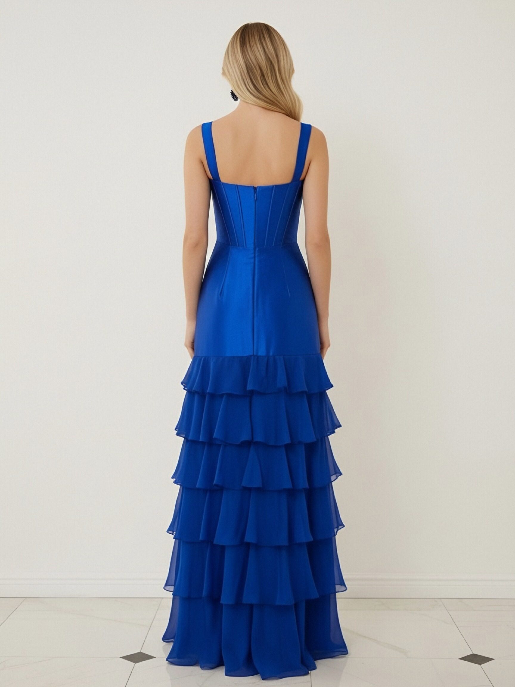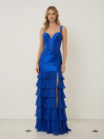 Satin V Neck Mermaid Prom Dresses with Ruffles
