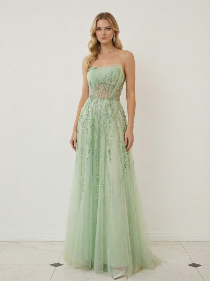 Tulle Embroideried Strapless A Line Prom Dresses with Applique