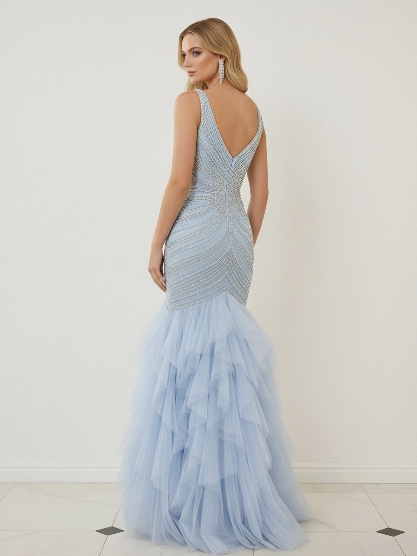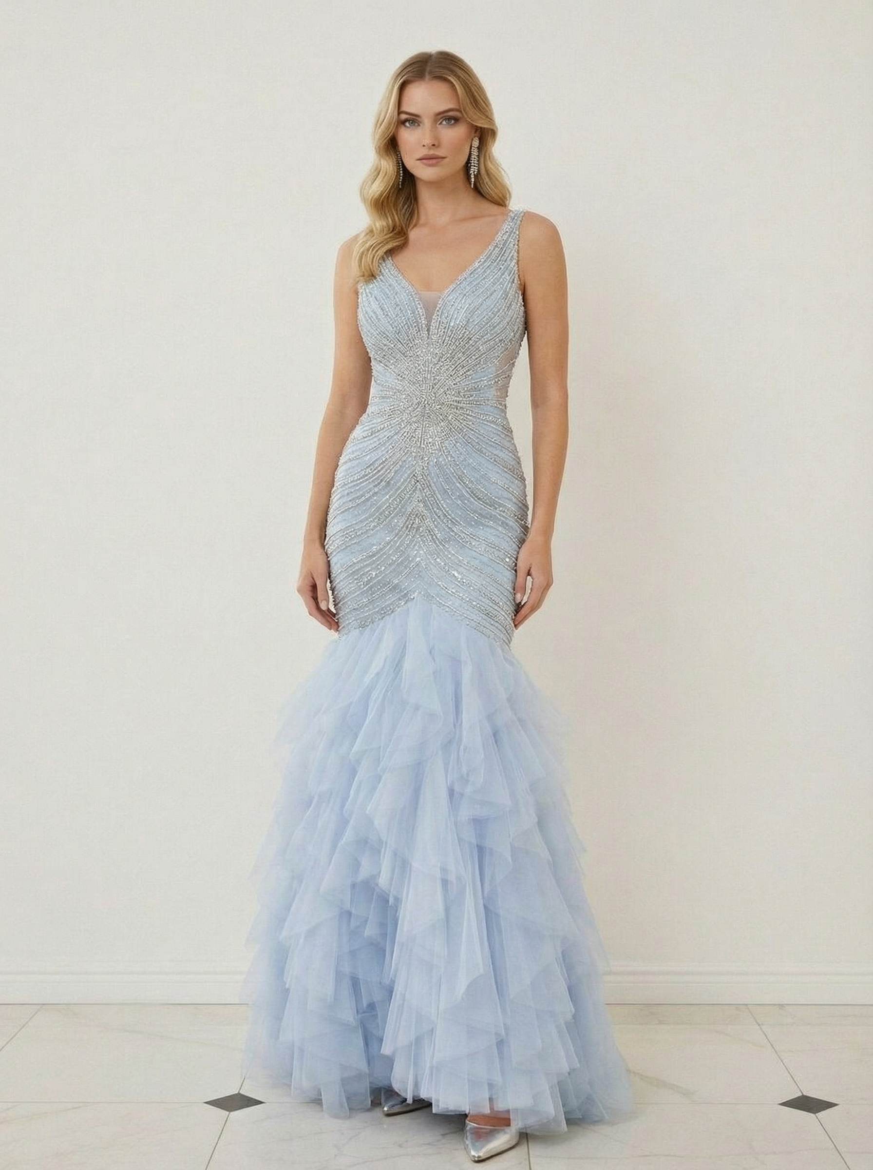 Tulle V Neck Mermaid Prom Dresses with Applique